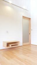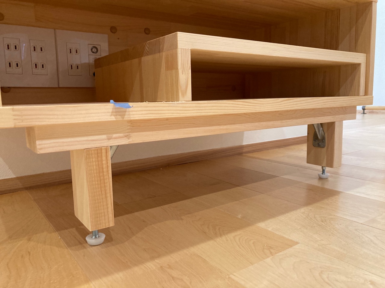 リビングのDVDレコーダー収納は床から浮かした片持ちの造りとしています。台の下をル●バが通れるようにしたいとの事でこのような形になっています。収納したい物の形状の都合、壁から約40㎝飛び出す格好で取り付けられています。DVD機器の重量くらいは持つようにがっちりとしたものですが、それ以上の荷重が掛かったらどうなるものか・・・。先日i様にはお子様が誕生されました。これから大きくなるにつれ、お子さんにとってはこんな高さにあるミリョクテキな台に上って遊びたくなる衝動は不可避と考えてつくってみました。固定はせずアジャスターで突っ張っているだけなので、u葉ちゃんが大きくなって取り外せる時期が来たら本来の浮いた形に戻ります。