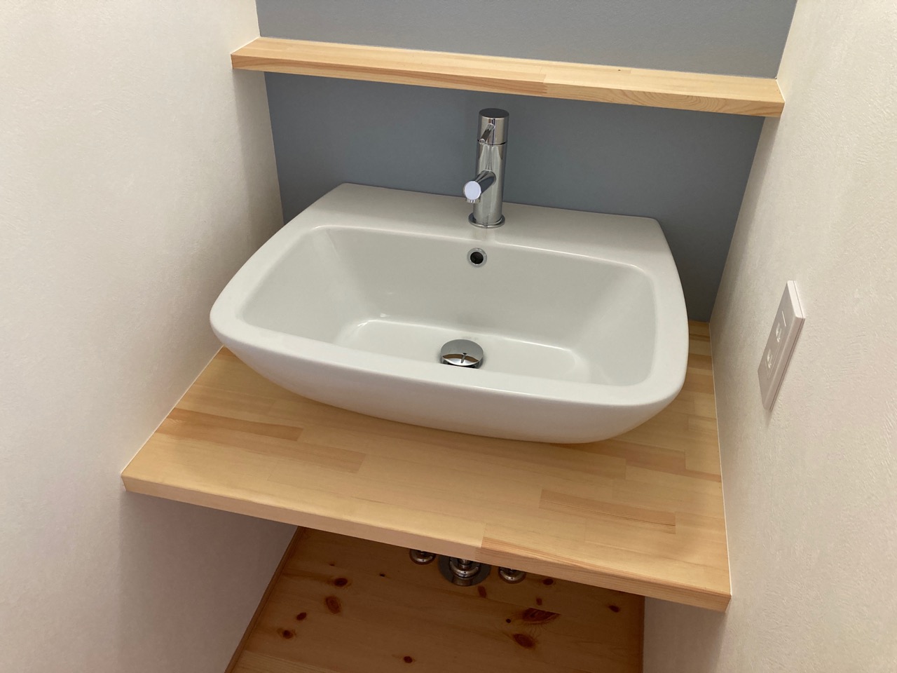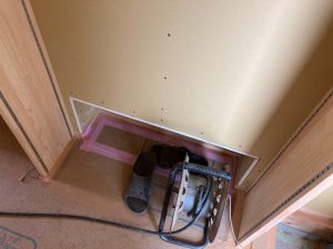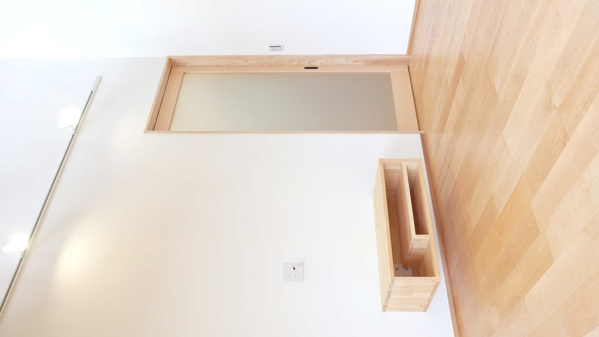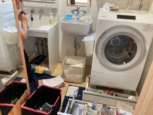 今回、洗濯機の排水は機械の中央に取ってほしいと設計段階からご希望がありました。普段は脱着がしやすいように機械に被らない端の方に取付けますが、お話を聞くと上記写真のようにキャスターの上に載せておきたいとの事。こうすればキャスターを引出し、洗濯機の裏も楽に掃除ができます。ネット検索で探し当てた方法だそうですが、なるほどこれなら気になる部分も洗濯機を動かすことなく掃除ができます。昔から『洗濯機は洗濯パンの上に置く』という固定観念があった筆者から見ればコロンブスの卵的なアイデアです。従来と比べて漏水しにくくなった洗濯機の性能向上の成せる業でもあります。時折、お客様からは建築業界の人間ではなかなか思いつかないような発想をもらう事があります。それも設計の楽しみの一つといえます。