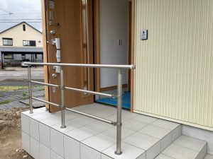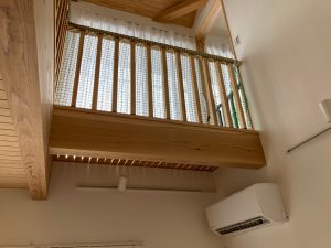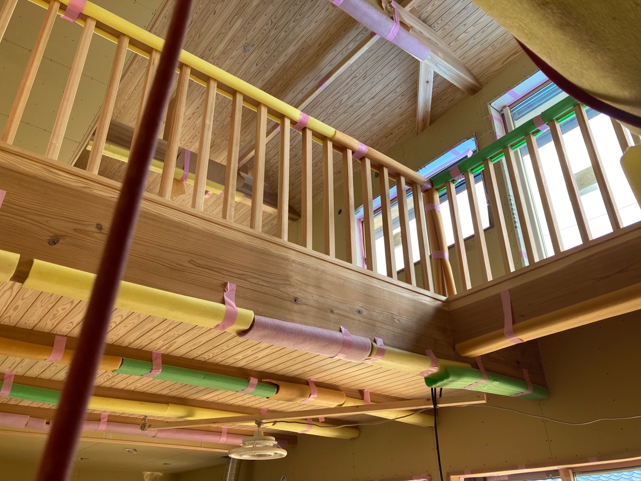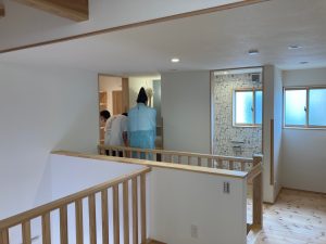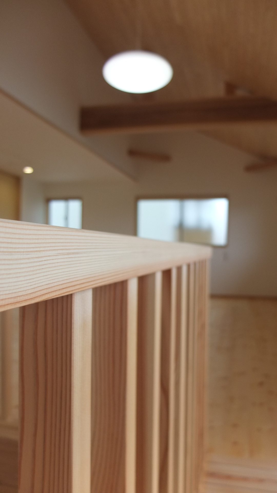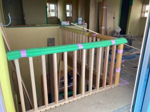 吹抜に手摺が取り付けられました。2階から得た採光が下階へ通りやすいオーソドックスな縦格子のタイプです。