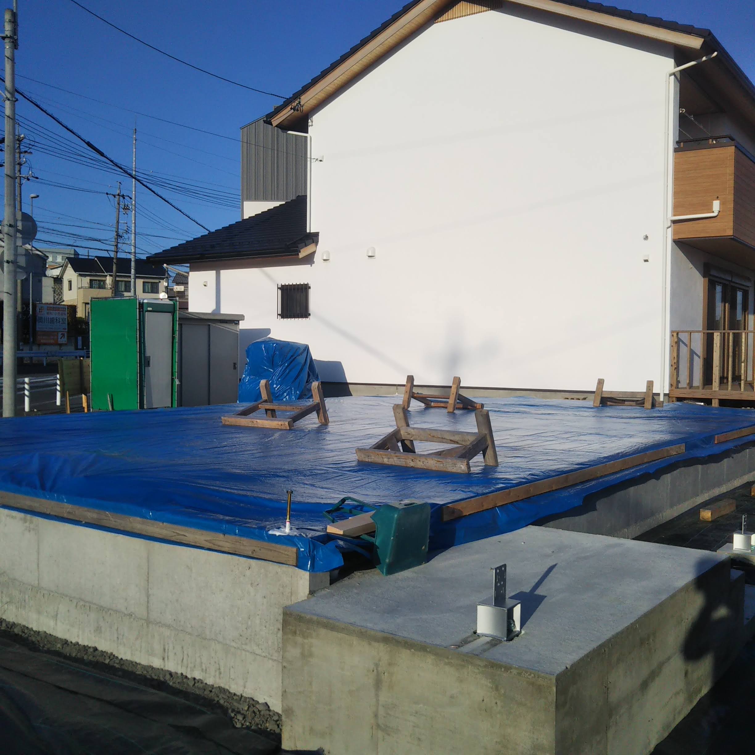 土台伏せ工事が終了しました。上棟までの間雨が降っても基礎内部にたまらないようにブルーシートで養生しておきます。外に飛び出たコンクリートの上に妙な形の物が固定されていますが、これは・・・? 上棟後に分かるようになります。
