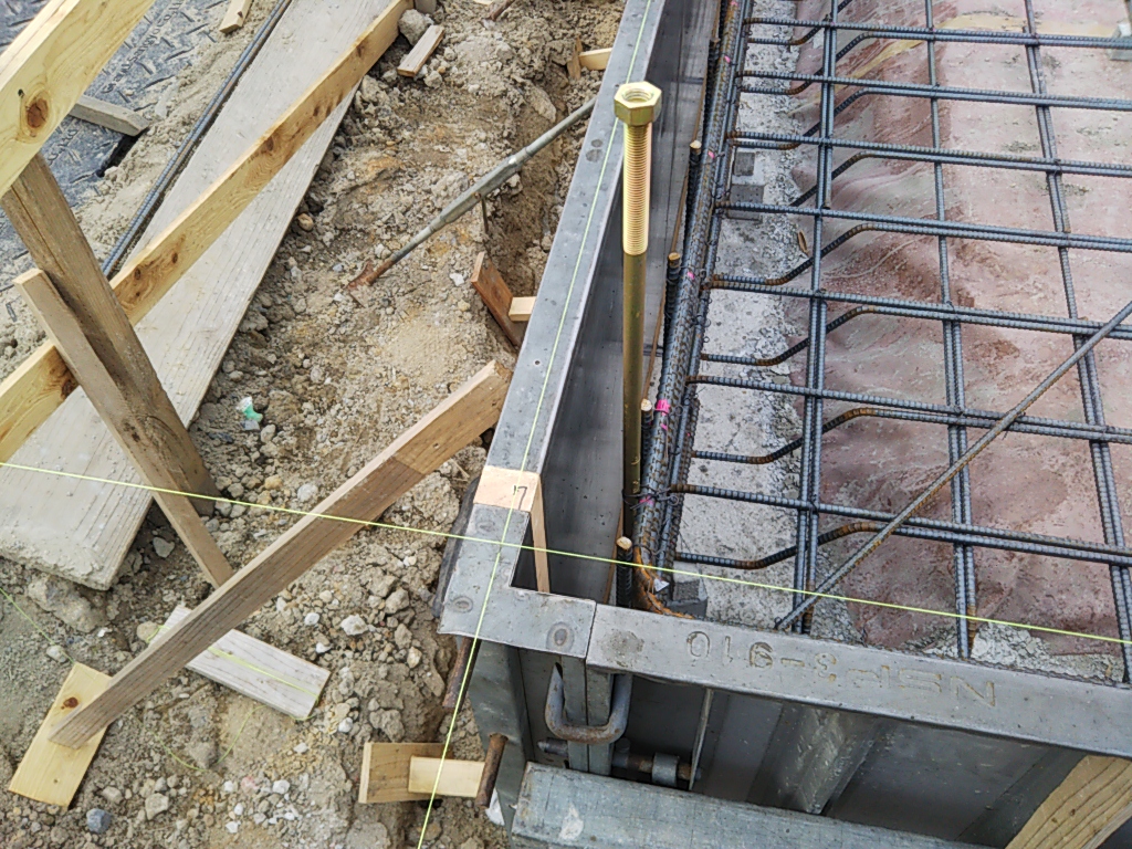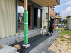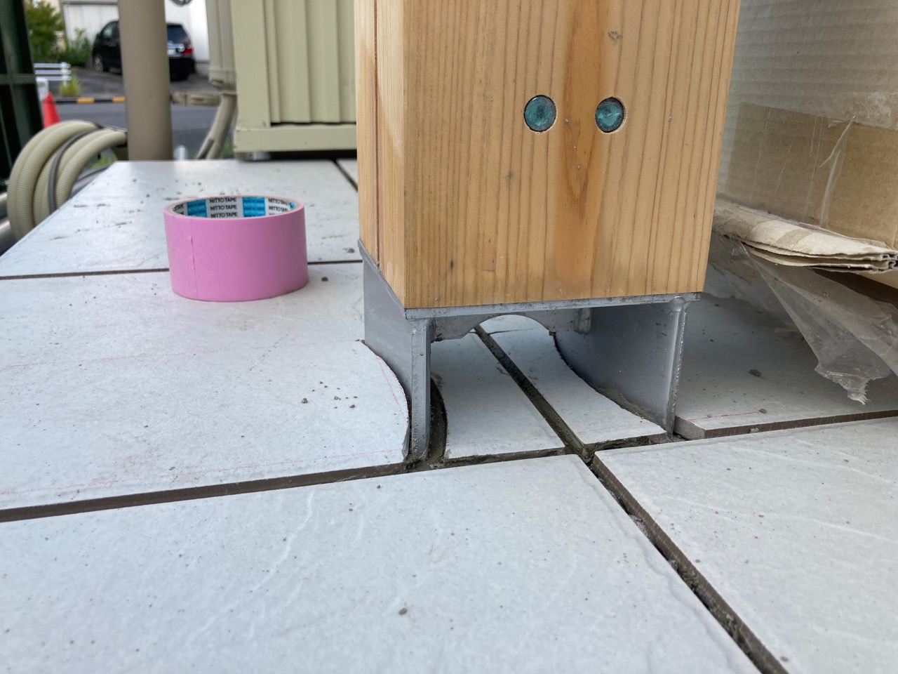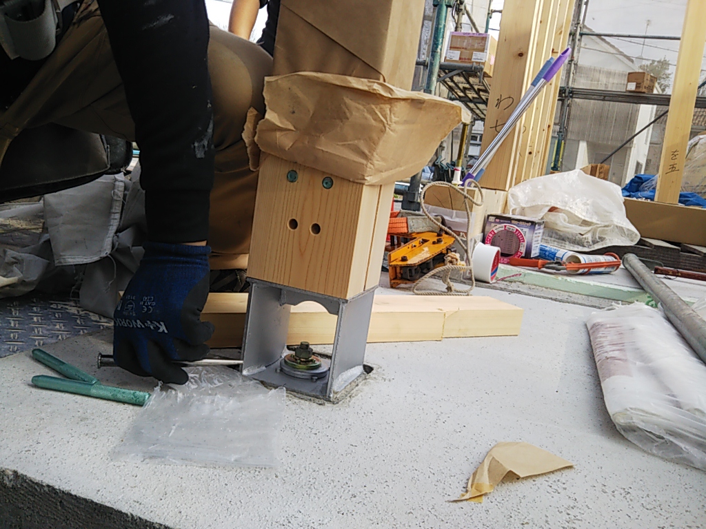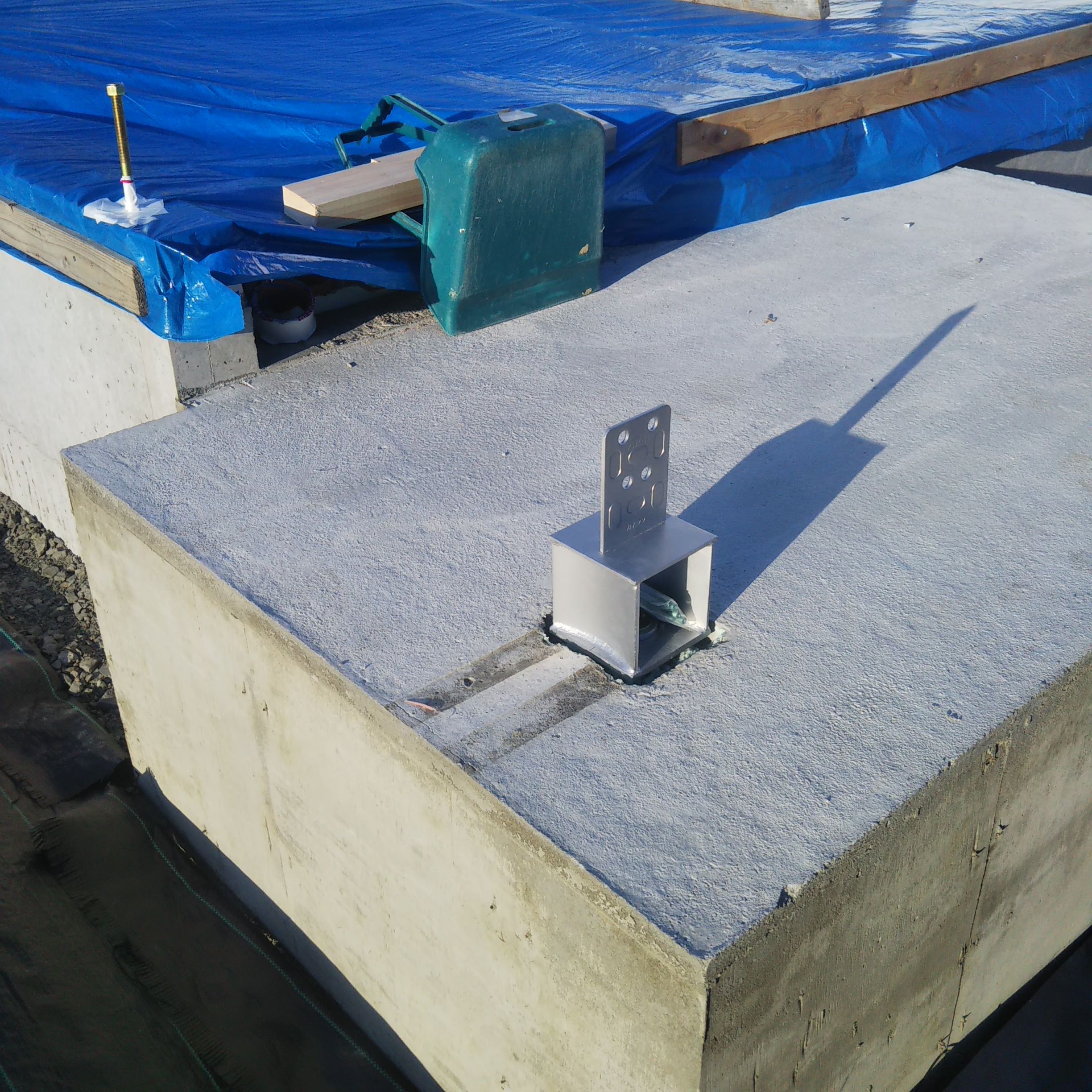 外部の独立柱部分には土台がありませんので、柱受金物をあらかじめ基礎コンクリート時に計画しておきます。この金物は本来は違う用途に使うものですが、微調整の効きやすさと立ち上がった時の見栄えがとりやすいため、よく使用しています。