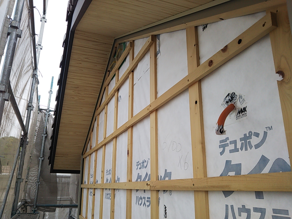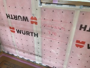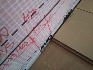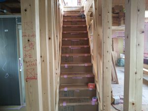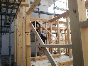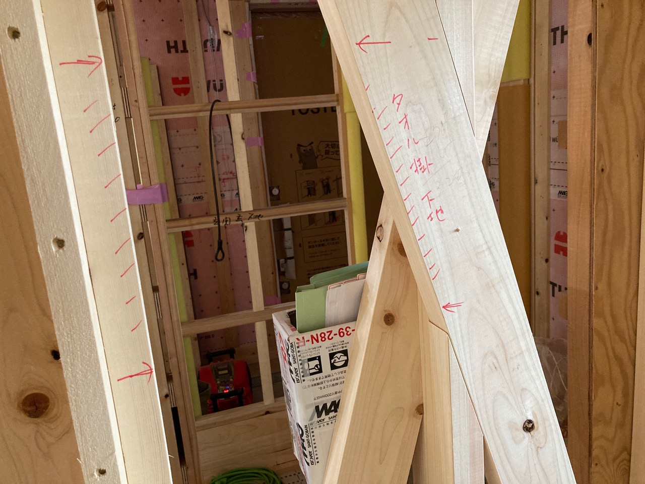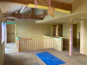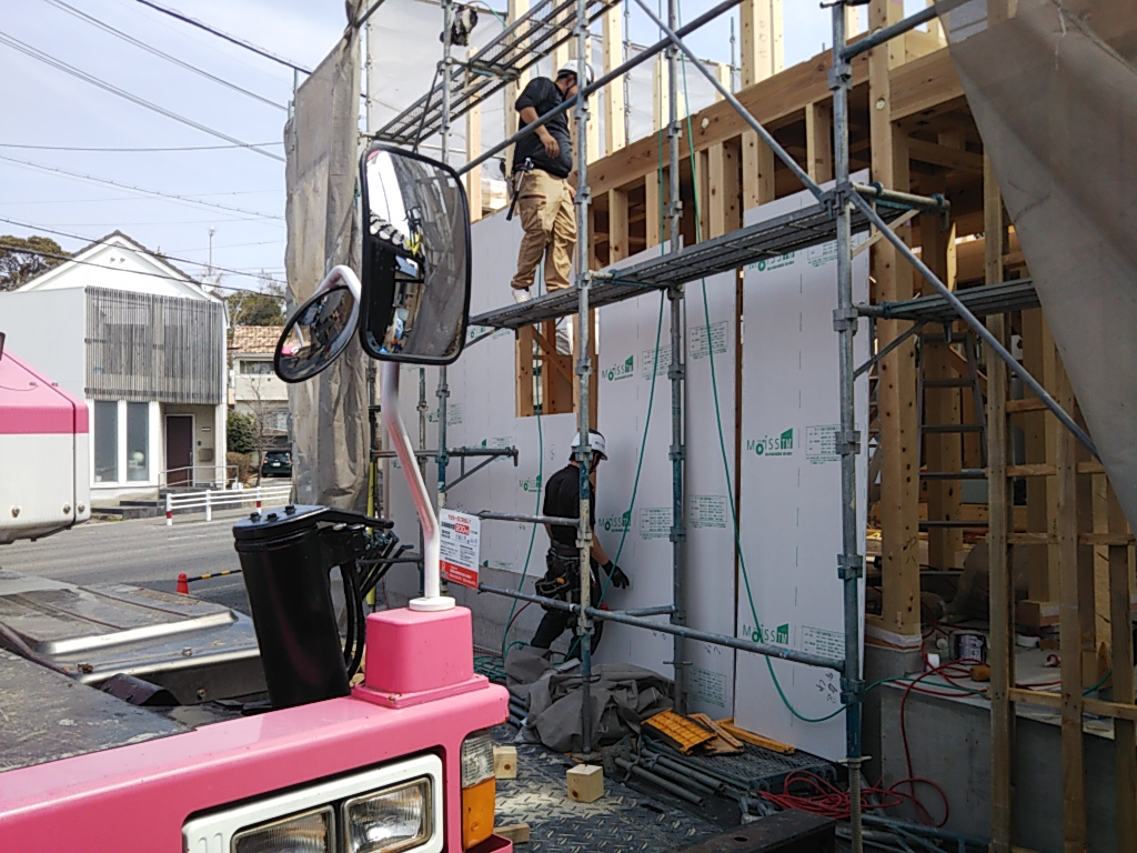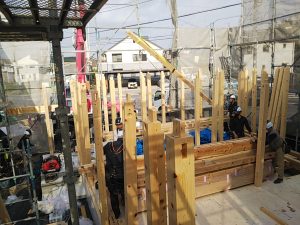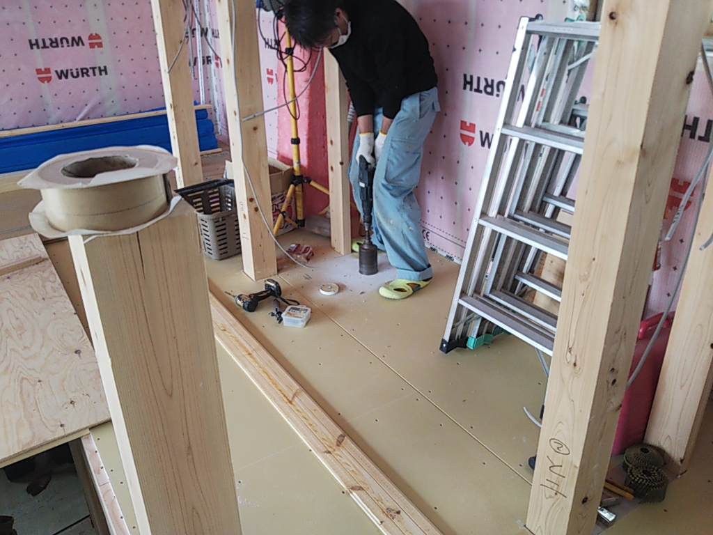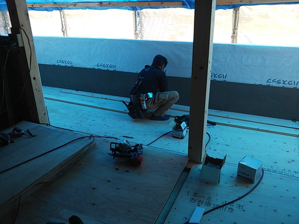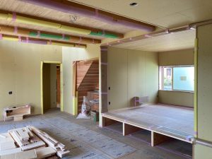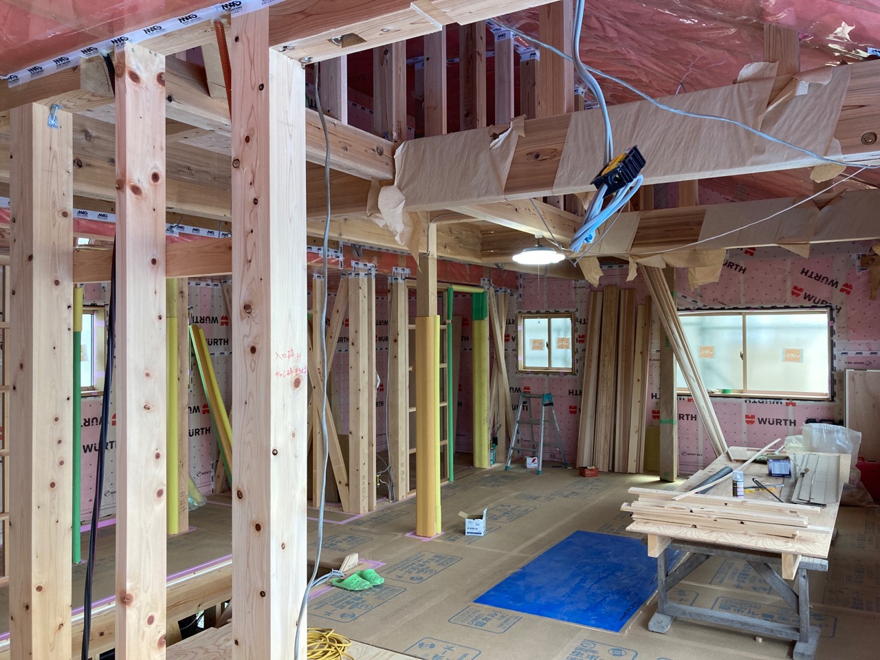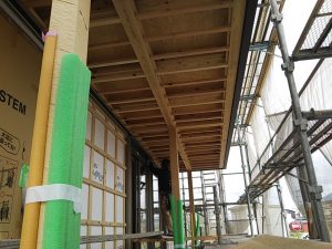 1階部分がおおよそ形になってきたところで、外壁面には構造用耐力面材を打ち付けていきます。こちらも従来の工法では筋違を打つのが主流の時代もありましたが、現在ではこういった面材を用いる方法にシフトしてきています。外壁面に筋違が無いので断熱材の敷設が非常にやり易い、耐力面材そのものに防火下地性能がある商品もあるので建築確認申請上、防火構造がつくりやすい、といったメリットがあります。無論、筋違よりも壁量計算における壁倍率が大きいので室内の間仕切りも極力減らすことができるという利点もあります。 筋違よりもオネダンがする、という事がデメリットと言えばデメリットでしょうか。