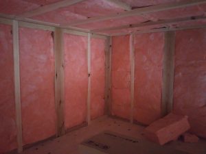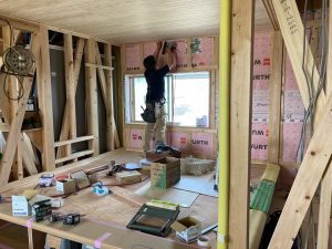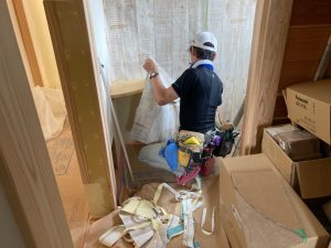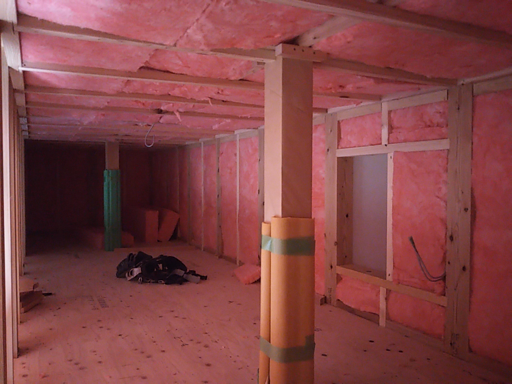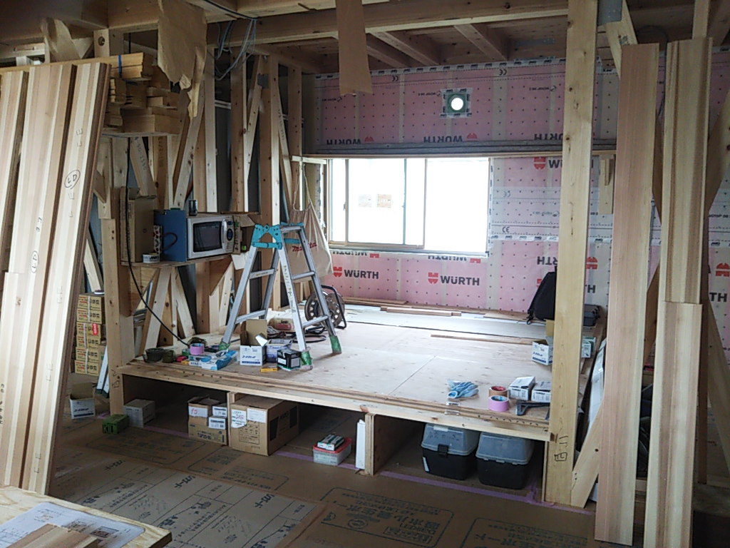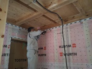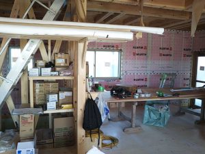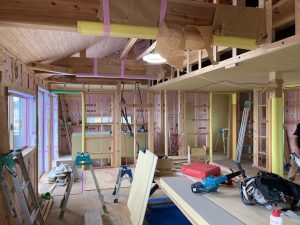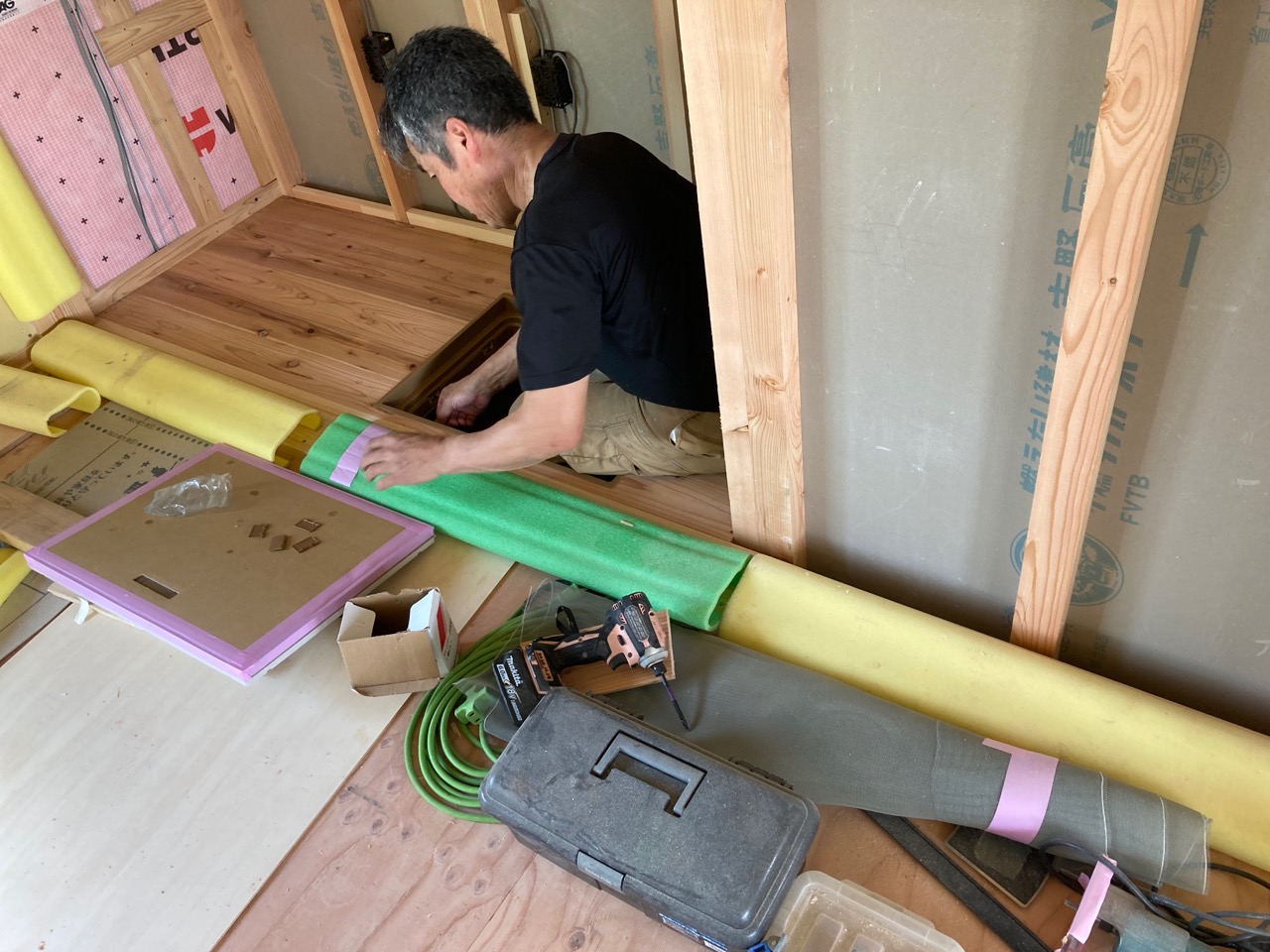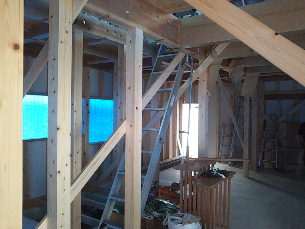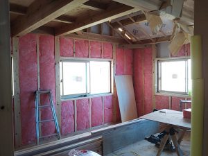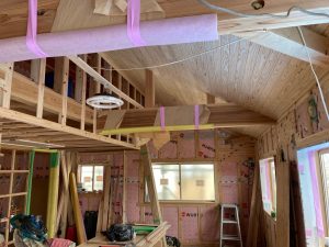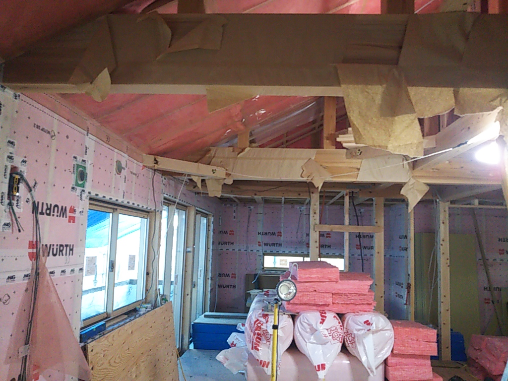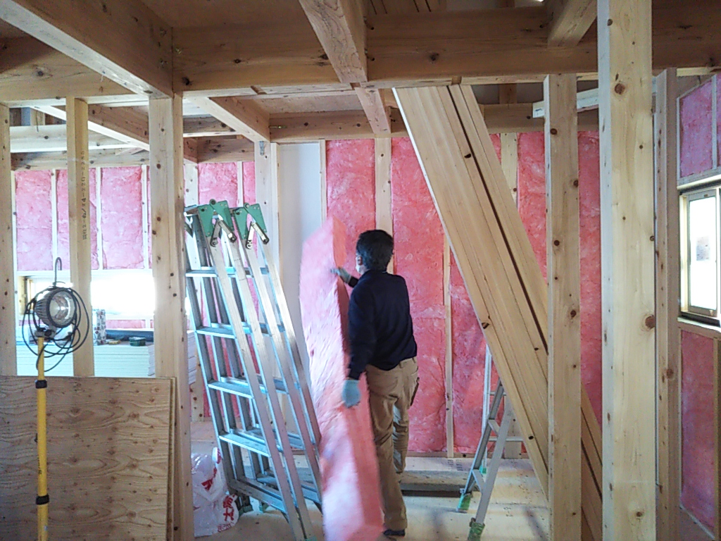 2階の壁は絶賛敷設中。木材ではなくふかふかのグラスウールを扱うため、棟梁の手が物足りなさそうにしているのは気のせいでしょうか。