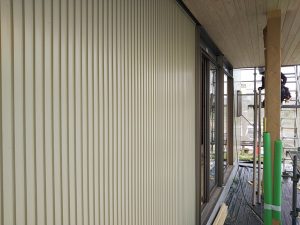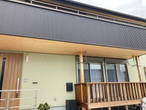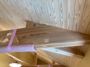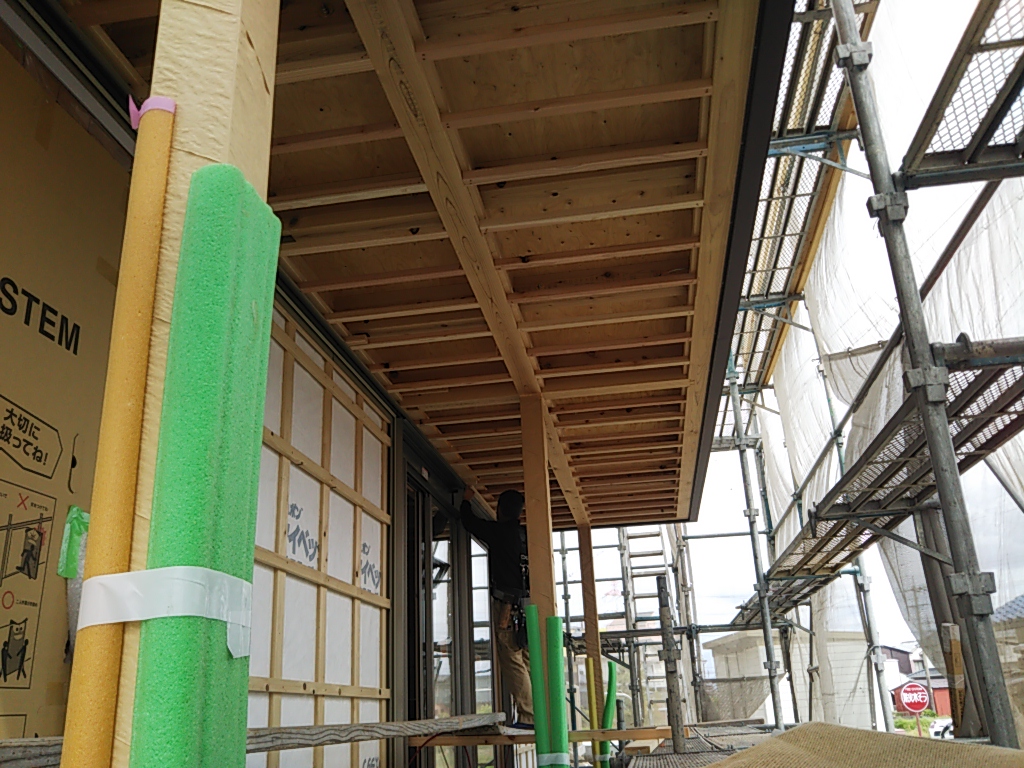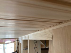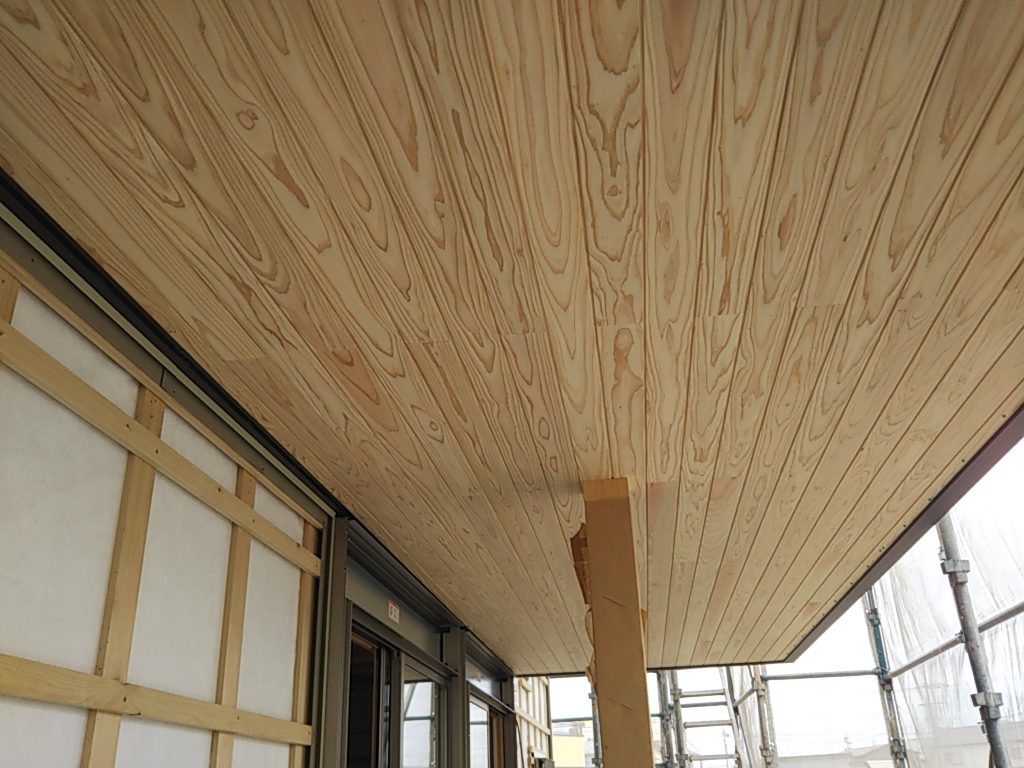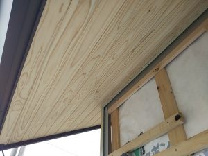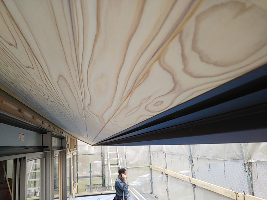 軒下やバルコニー下の天井が杉の羽目板で整然と張り付けられました。心配していた高さも問題なくピタリと収まったようです。