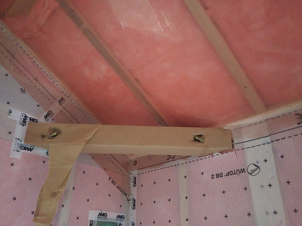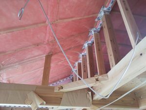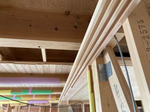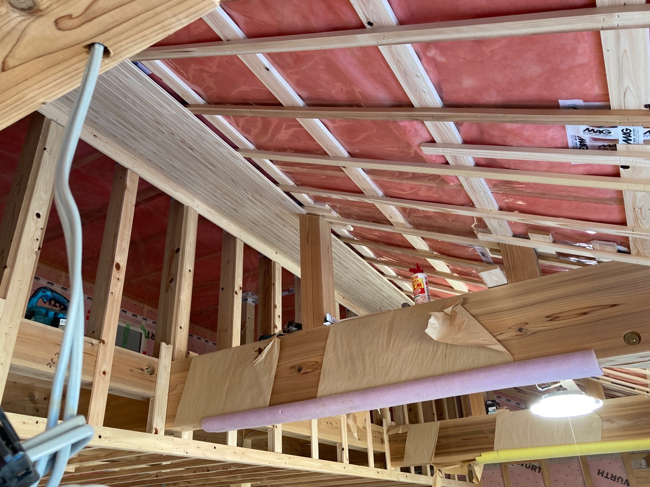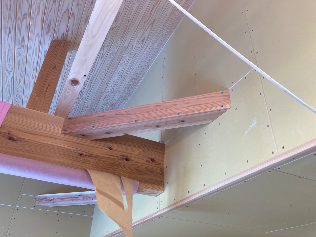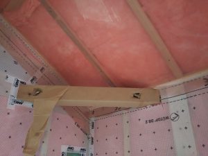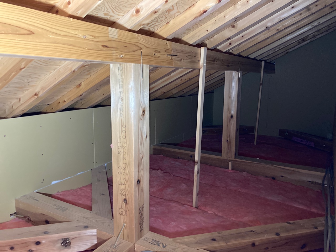2階部分の断熱材が充填されてきています。屋根勾配に合わせた勾配天井の上部にもグラスウールがこれでもかと詰め込まれました。勾配天井部分は水平構面が取れませんので、水平力に対しては屋根構面と火打構面で耐える計算をしています。実際に火打梁を取付けるのですが、軒桁に近い部分は断熱材を厚く入れる分、天井面が下がってきます。軒桁と火打梁の上面の高さを揃えてしまうと、火打が一部分天井にめり込んでしまいます。そうならないように火打の取付高さを下げて取付けています。