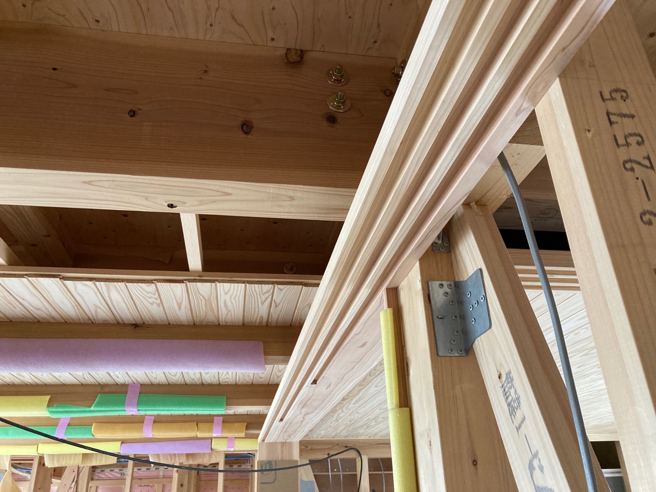 化粧火打梁のボルト穴もこのように隠してもらいました。こちらは火打梁の表面の寸法そのままの大きさの板を貼り付けて隠しています。