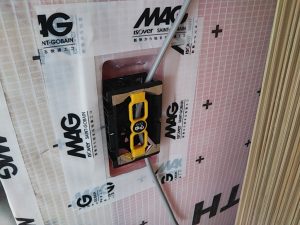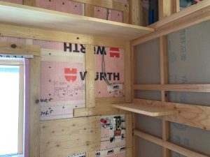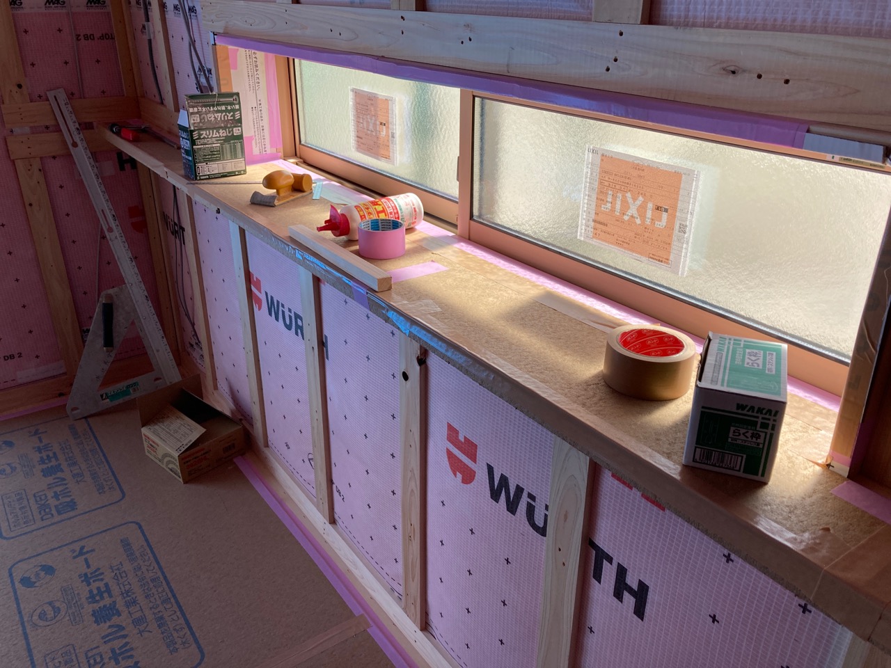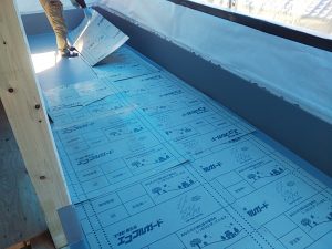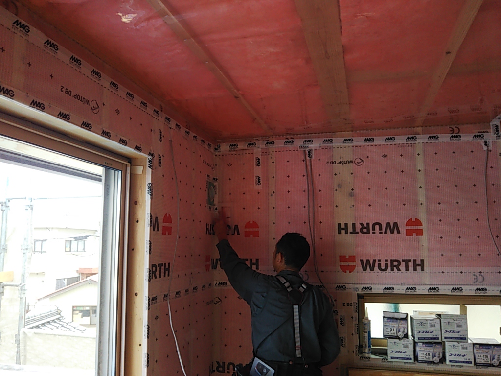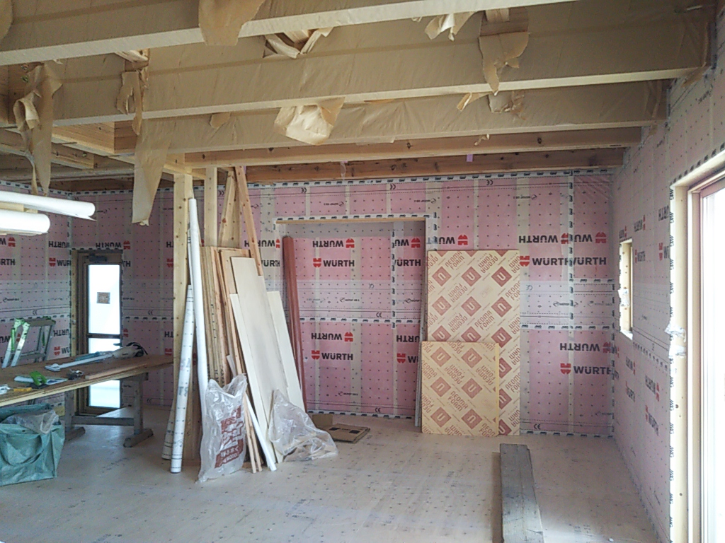 壁の断熱材が充填され、高気密シートが敷設されました。さすがw辺棟梁、仕事が早い。