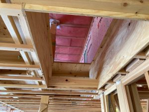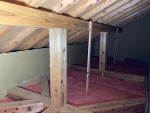 『赤の洞窟』部分です。ここは小屋裏収納として利用。人目に触れない収納部分ですので、この後気密シートを敷設する以外は特に仕上工事を行わず、予算削減としていきます。