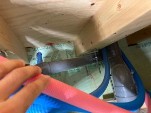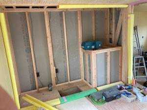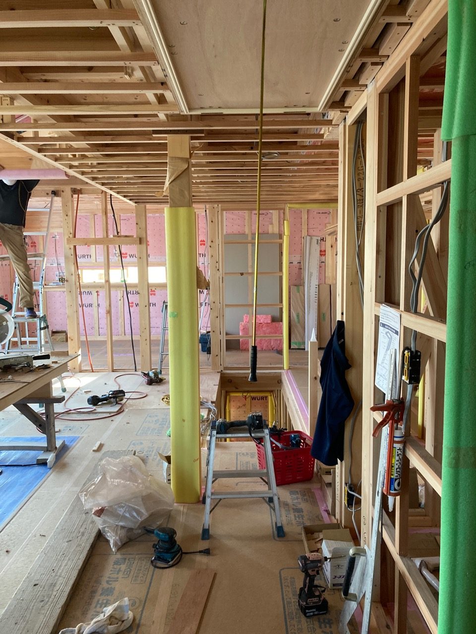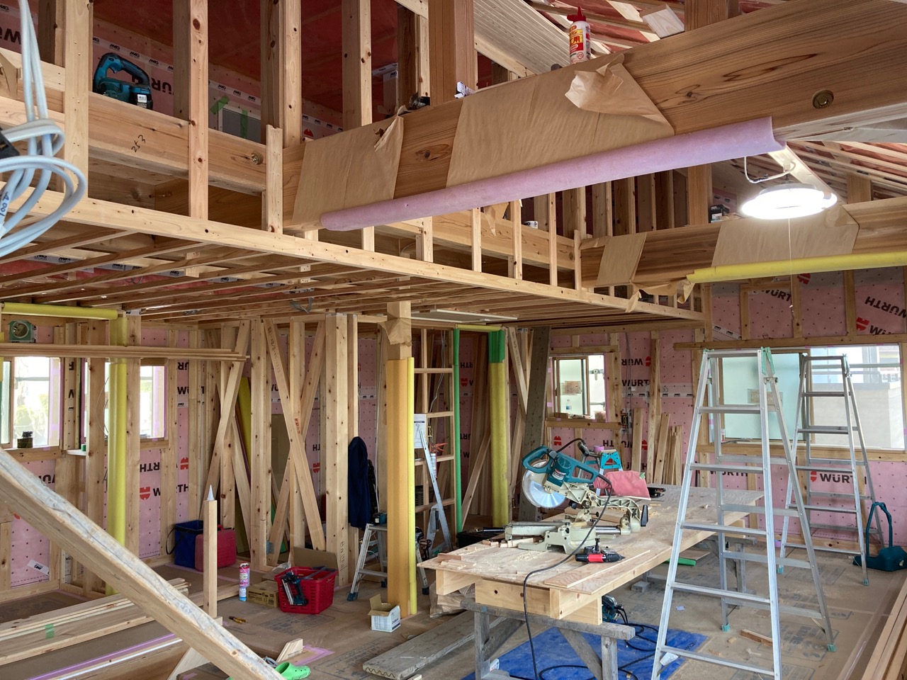 屋内は引き続き設備配管工事の真っ最中。天井裏で見えなくなる部分ですが、この部分をどの経路を伝えば一番良いか、梁の寸法と天井高さの関係性は問題ないかを間取りを考える時点で考慮しておかないと現場が始まってから大変な目に遭います。