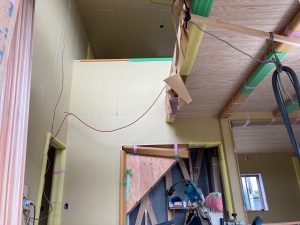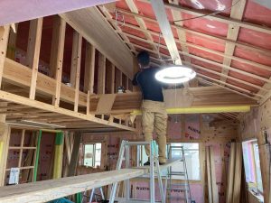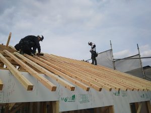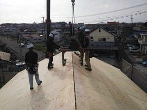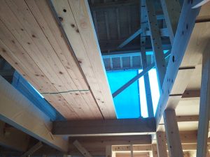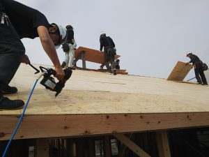 屋根下地の合板が敷設されていきます。小屋裏には勾配天井とするため、水平剛性を負担する水平構面が一部と火打梁のみとなりますが、この屋根合板も所定の垂木ピッチと所定の熱さの合板を使用する事で屋根勾配の割合によって『屋根構面』として構造耐力に算入する事ができます。