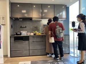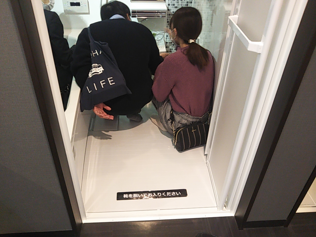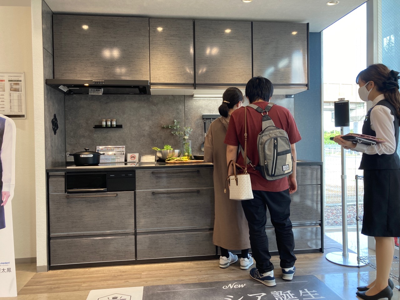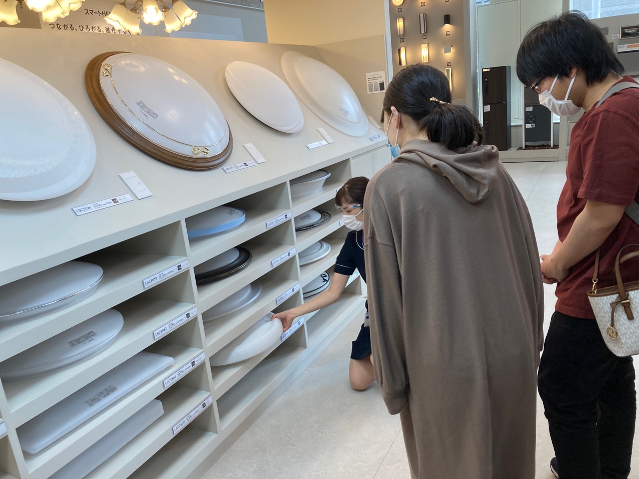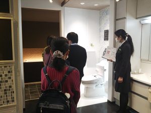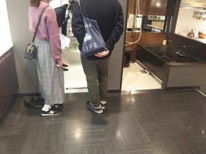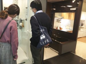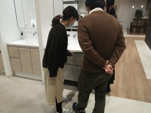 設備のショールームの見学にやってきました。i様ご本人はこういったショールームに訪れるのは初めてですが、昨年ご親戚の住宅をミノワで建築していただきましたので、同席してもらいました。経験則からくるアドバイスをもらいながら検討を重ねていきます。