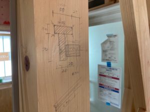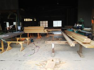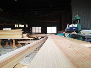 工場では今回担当予定のw辺棟梁が主に枠材などの造作材を加工しています。現場自体はまだ基礎コンクリート工事の段階ですが、詳細図により寸法が分かる材料だけ先に刻んでおこうという事でプレーナーなどの機械と格闘しています。