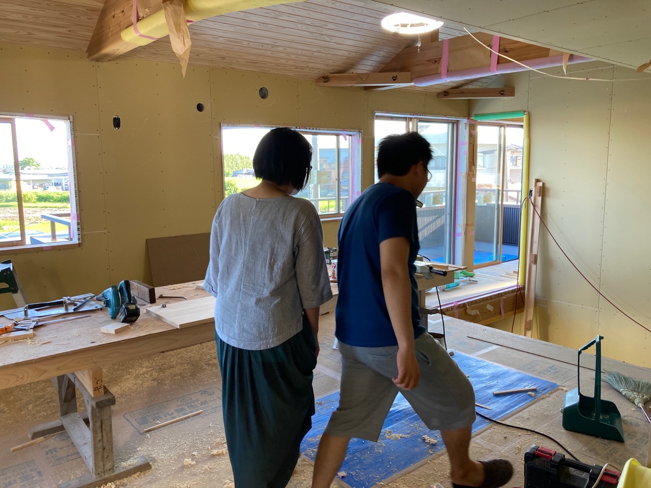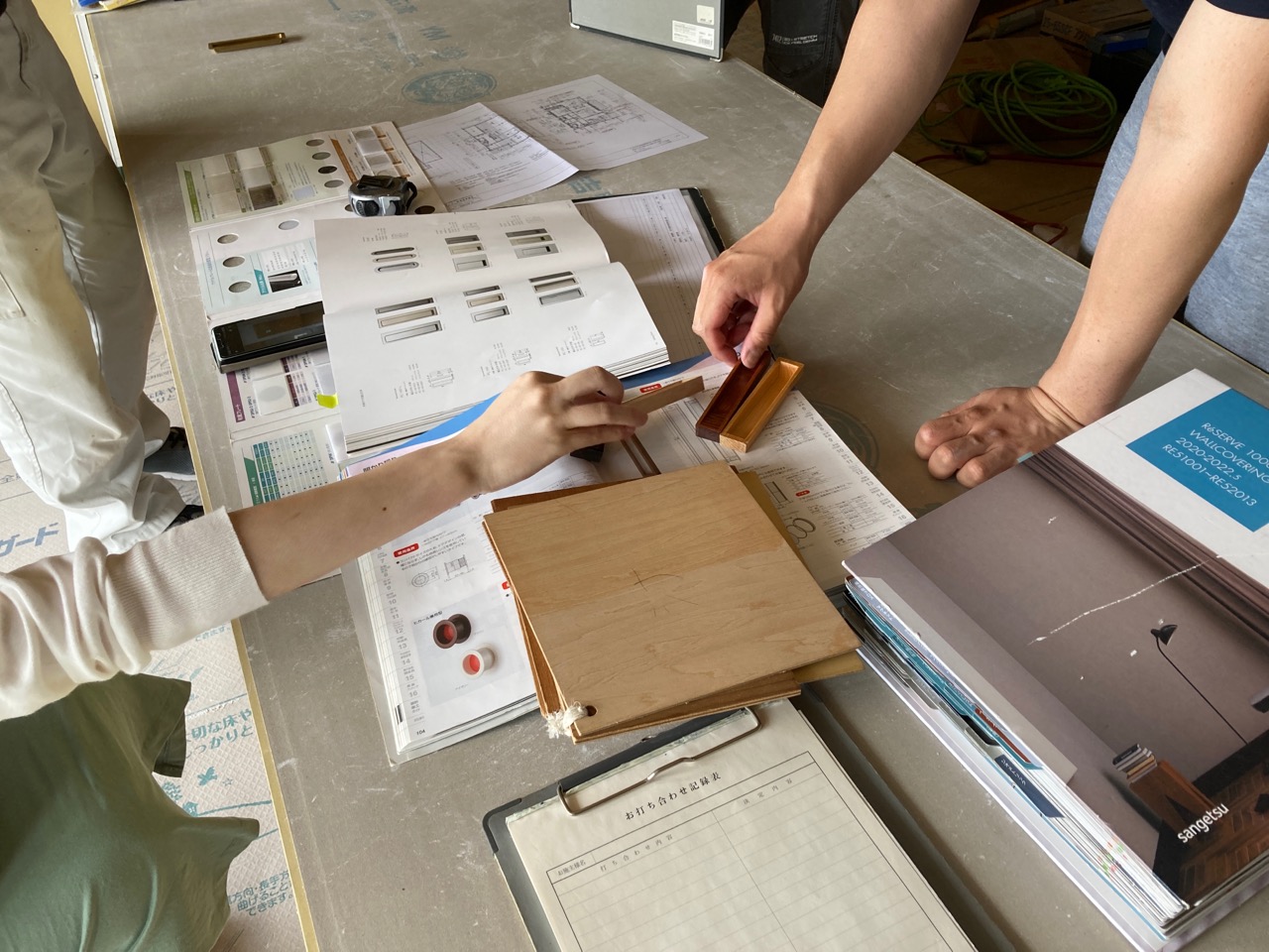 本日は現場でi様とお打合せも行いました。基本的に電気配線の打合せでしたが、その他細かな収まり等もどうするか、という点についても打合せは進みました。