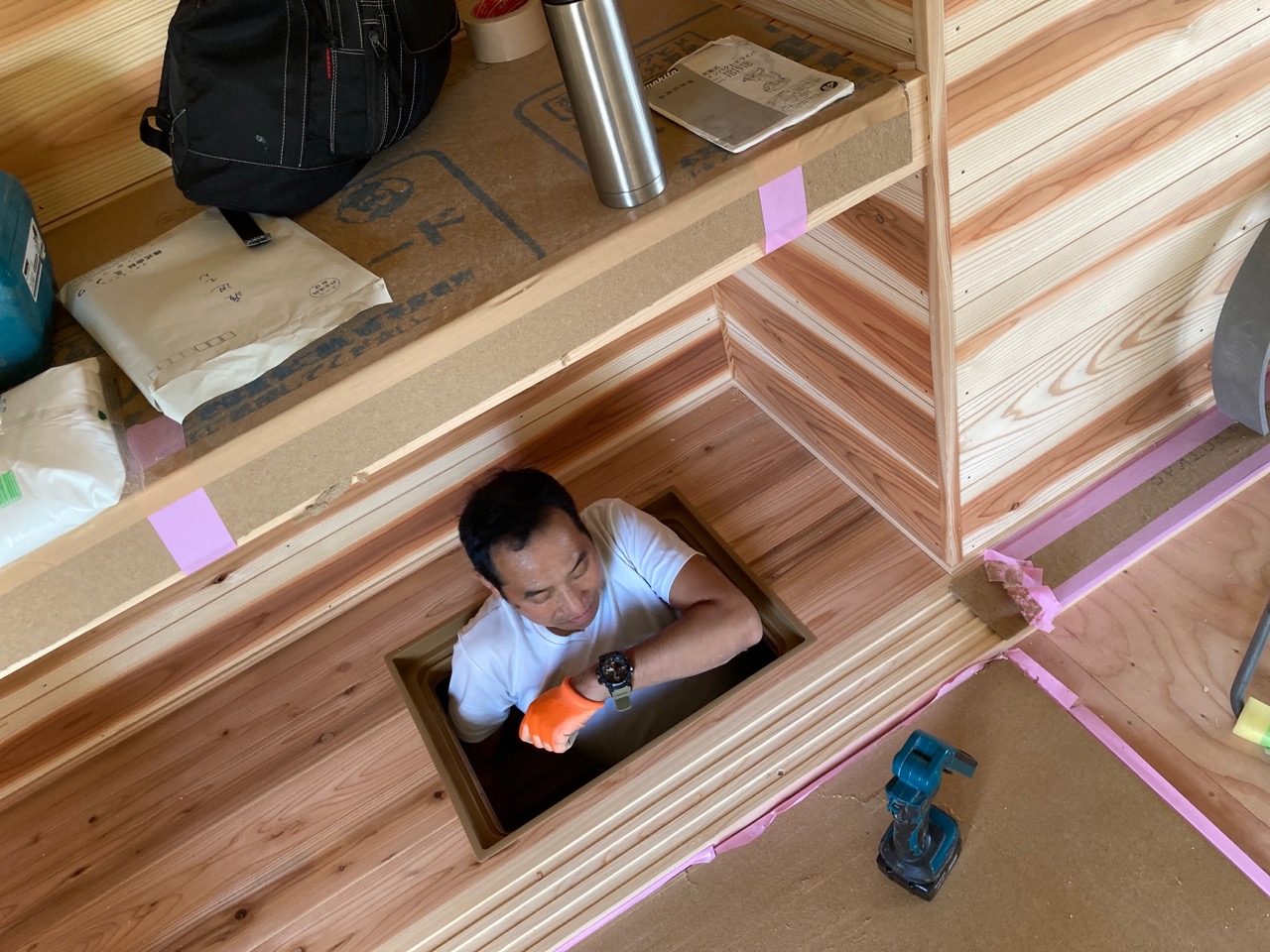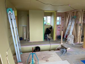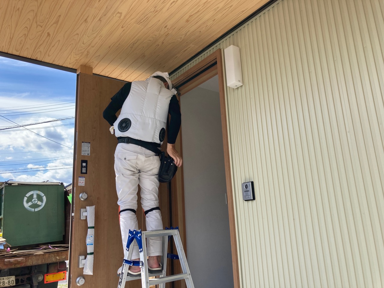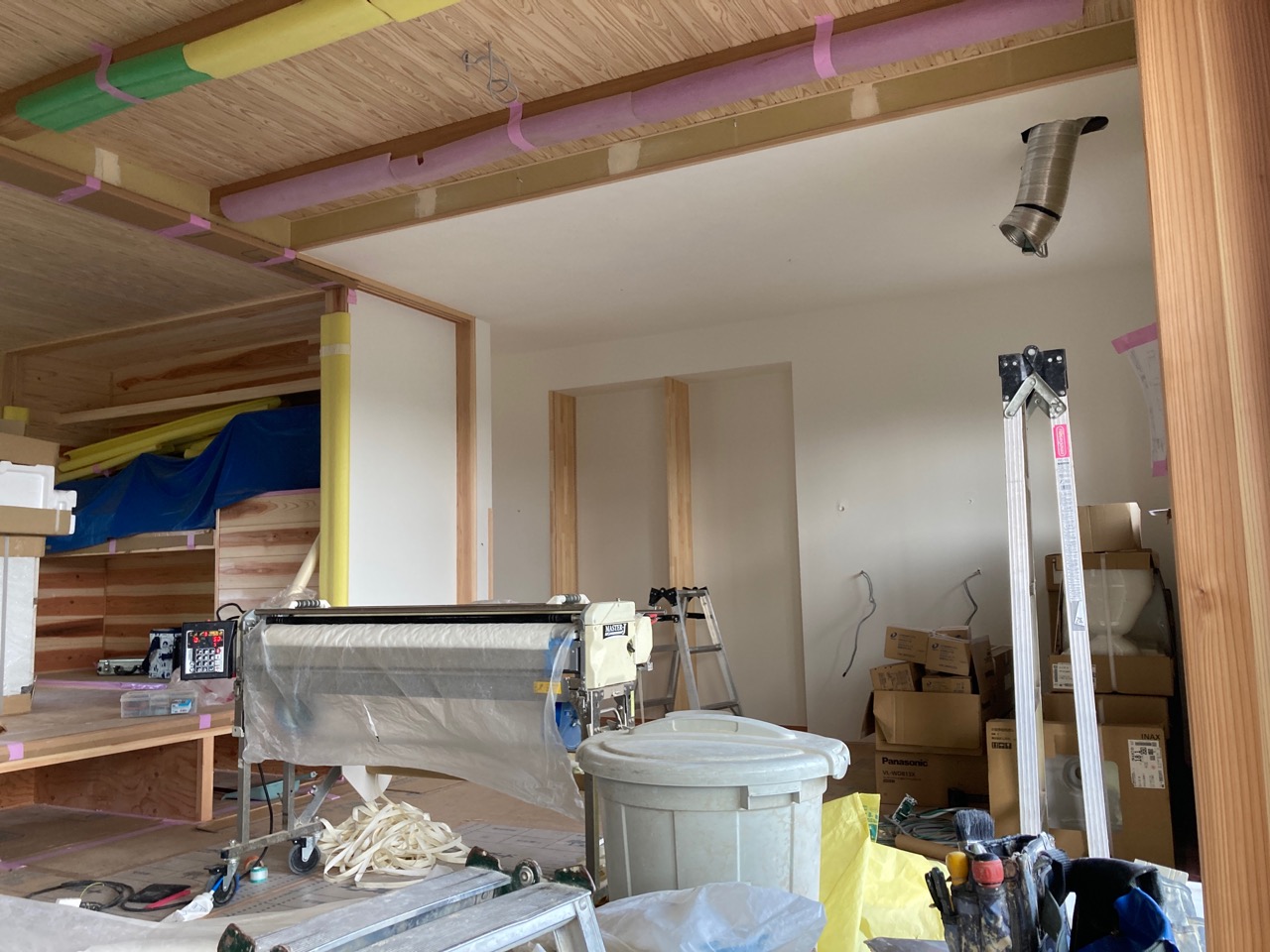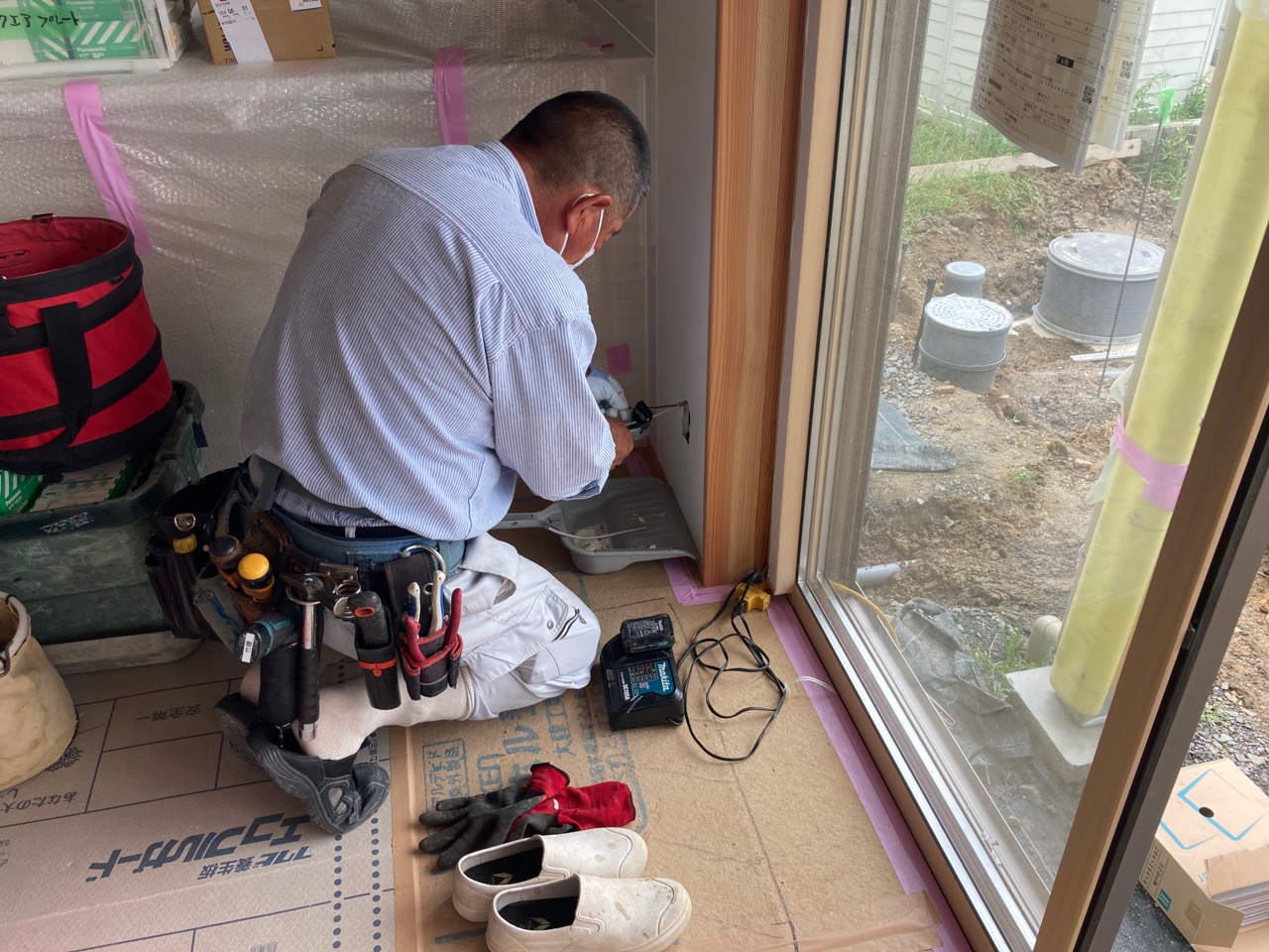 現場内も設備設置の真っ最中。本日もいろんな業者さんが入り乱れカオスの状態は続きます。来週8月11・12日に行われる現場完成見学会に向け慌ただしくなってまいりました。