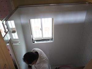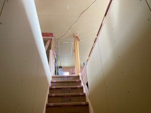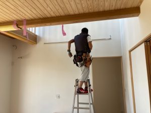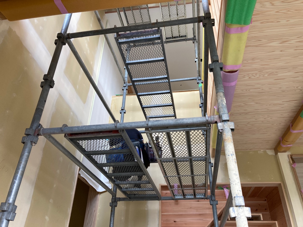 ???室内の中に外部に使うような鋼製の足場が。1階から2階天井へ吹き抜けている部分の壁はこうして足場を組んで施工します。施工してくれるクロス職人は、またまたまたy本さん。毎度ひと手間かかる現場でスミマセン。『誰だこんな間取りを描くヤツは』と追及されそうです。