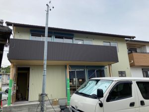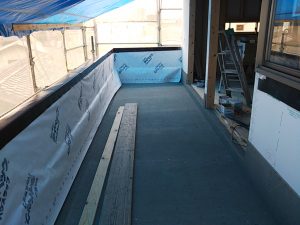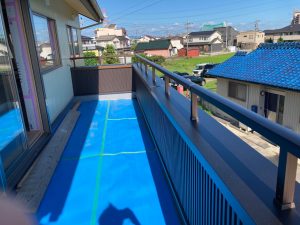 バルコニーのFRP防水工事が終了していました。釘などが落ちて雨に濡れたりすると錆色がついてしまうので養生を施します。柔らかいマットを敷いてその上に養生シートを敷きます。