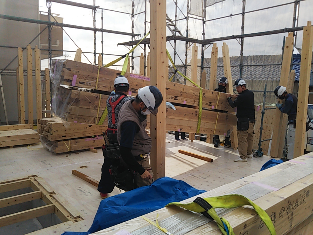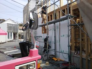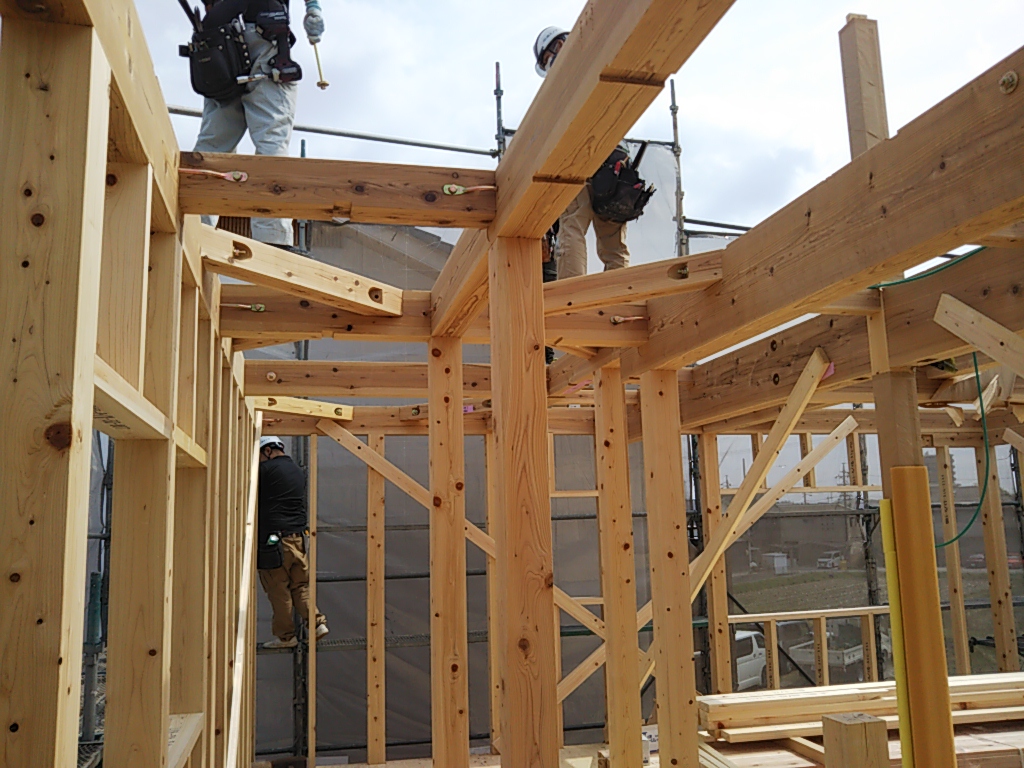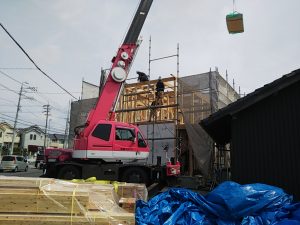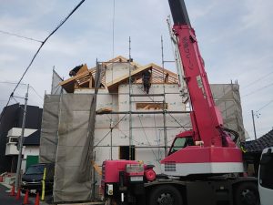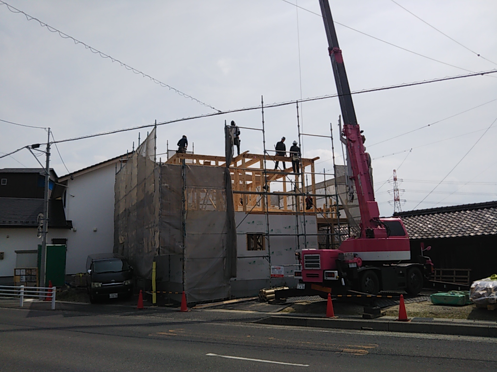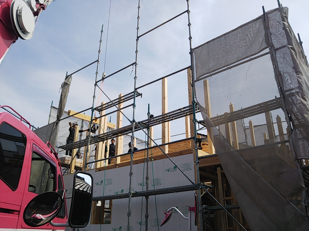 2階もだんだんと形になってきました。この時点でまだ午前11時頃、早い! さすがの手際です。この現場は一昨年に竣工お引渡しさせていただきました、mi様邸 のご親族の方の住宅です。後方にmi様邸の建物も見えています。主要道路の交差点の角にある立地ですので、信号待ちの車両からはよく見渡せます。営業担当としては宣伝効果は抜群の条件ですな。