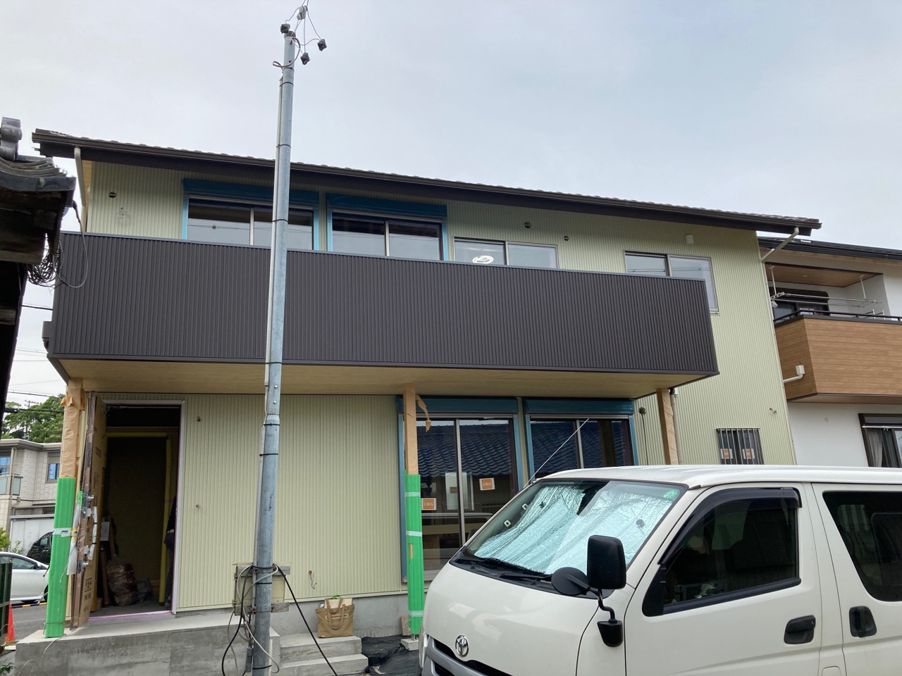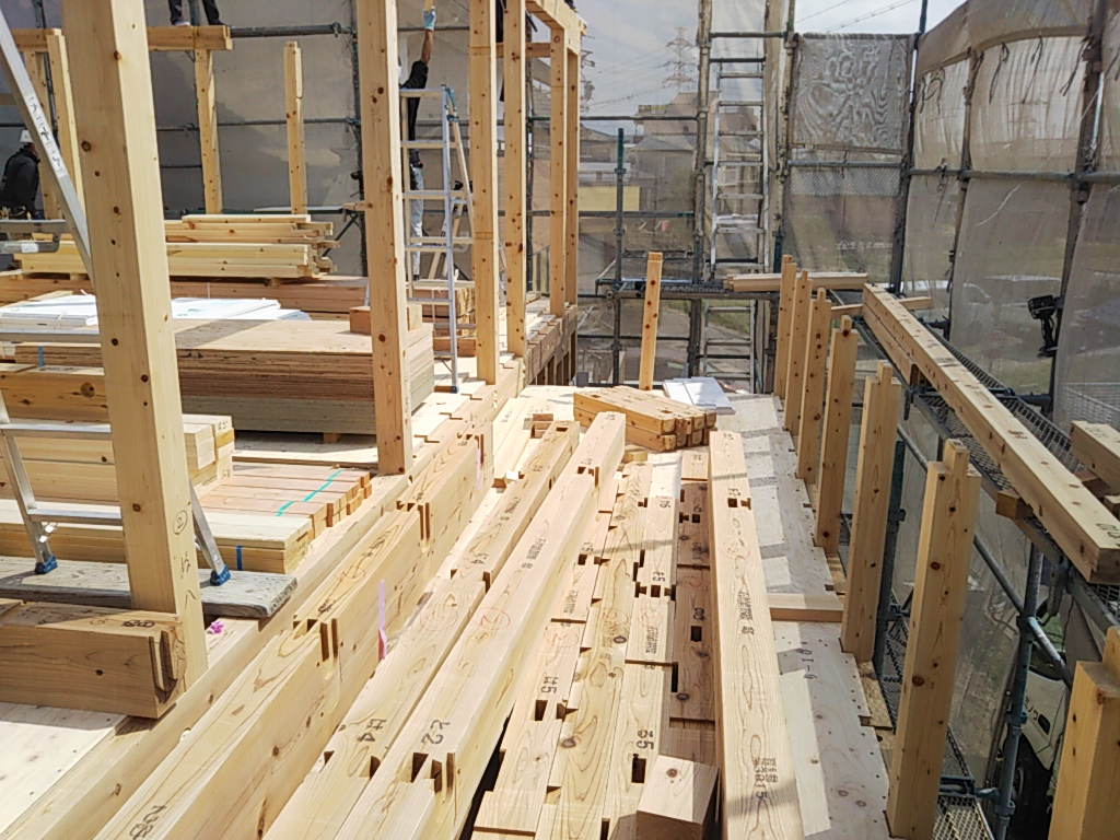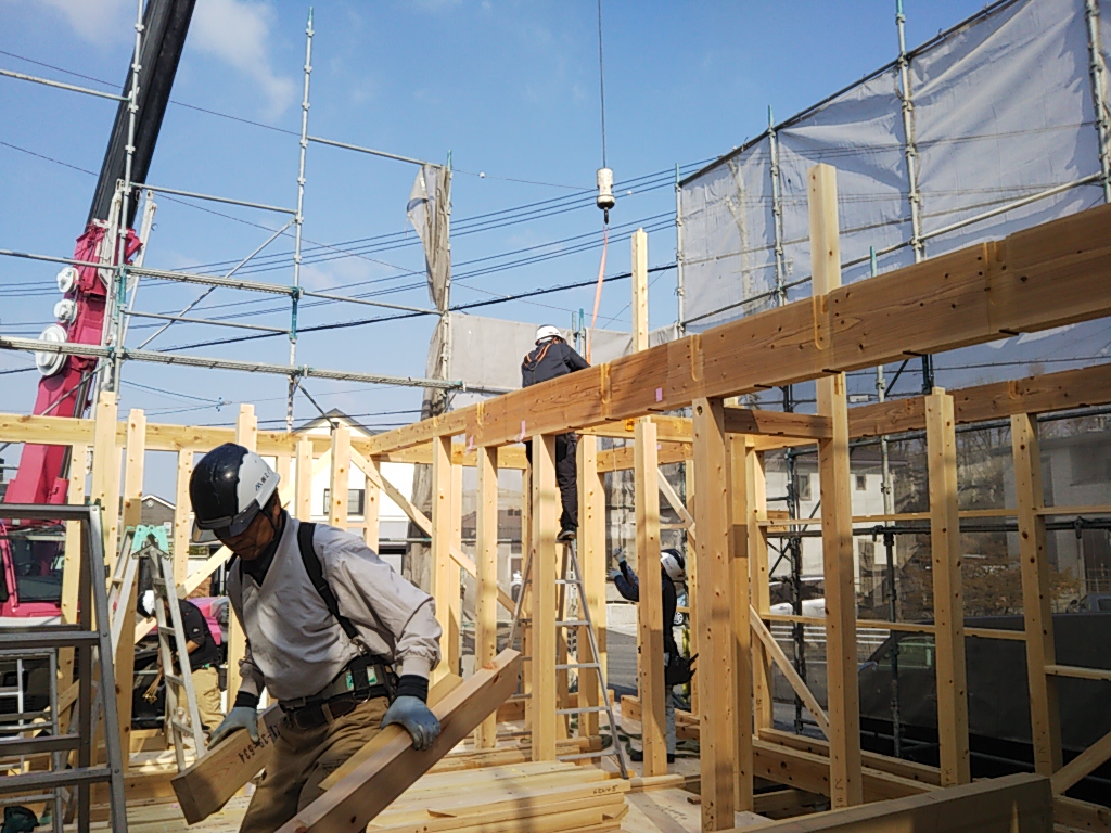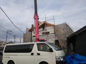 2階もだんだんと形になってきました。この時点でまだ午前11時頃、早い! さすがの手際です。この現場は一昨年に竣工お引渡しさせていただきました、mi様邸 のご親族の方の住宅です。後方にmi様邸の建物も見えています。主要道路の交差点の角にある立地ですので、信号待ちの車両からはよく見渡せます。営業担当としては宣伝効果は抜群の条件ですな。