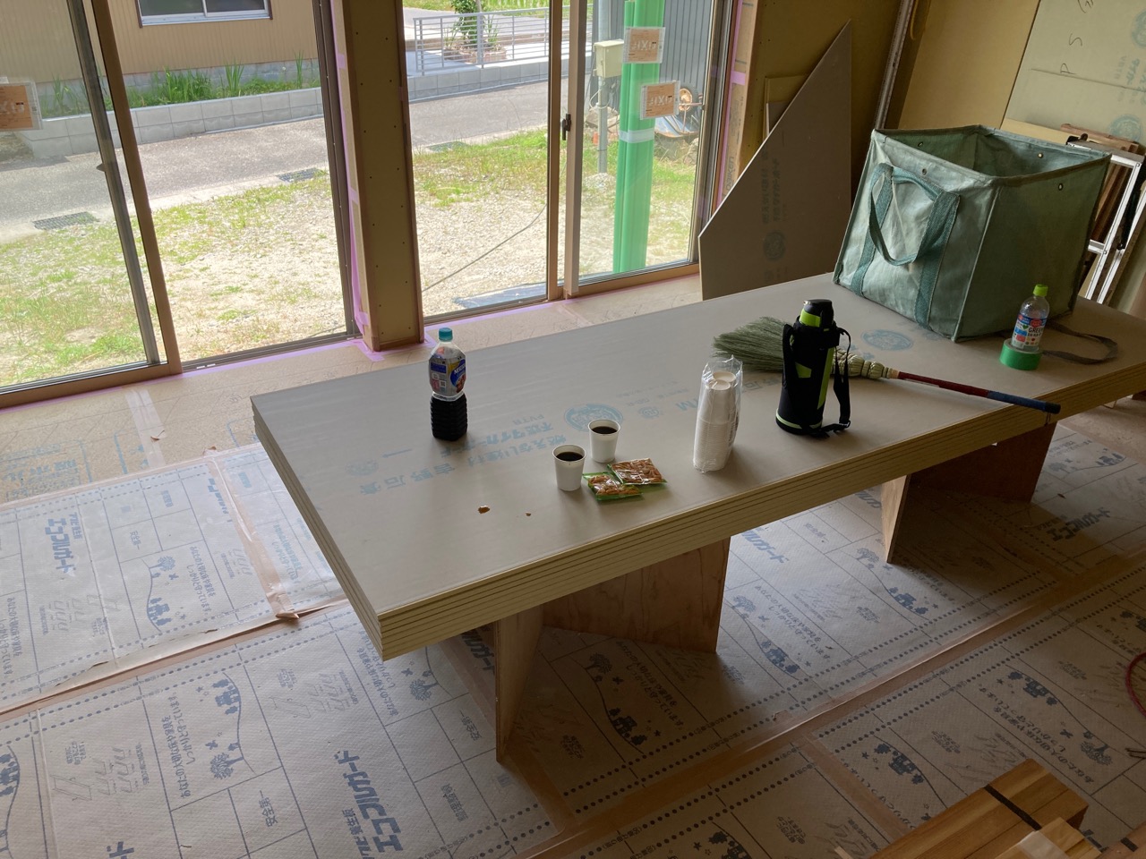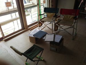 現場でのお打合せ準備。キャンプ用の椅子を持ち込み、現場にあった合板などで即席のテーブルを作っていざお打合せです。