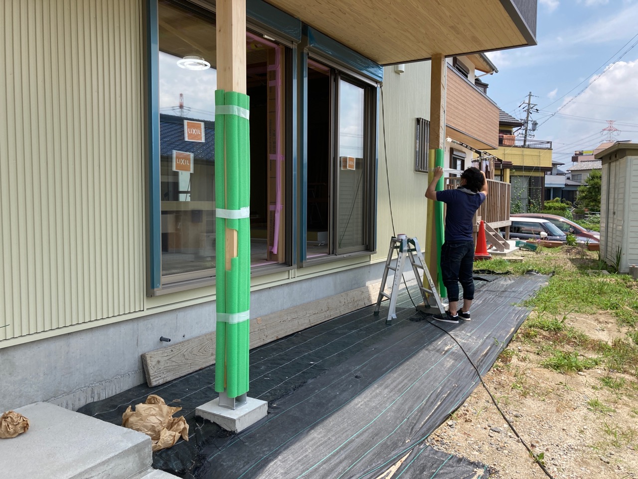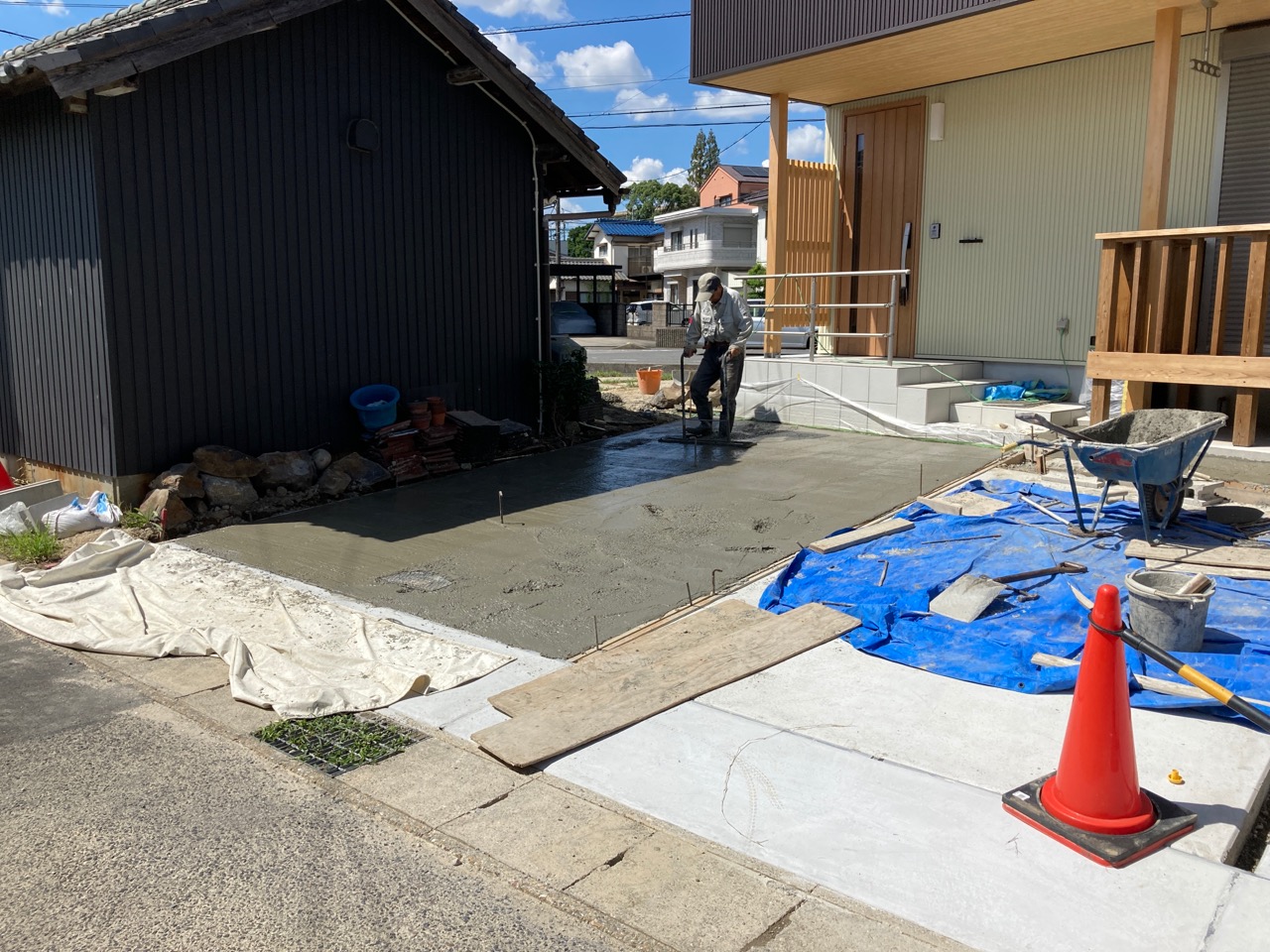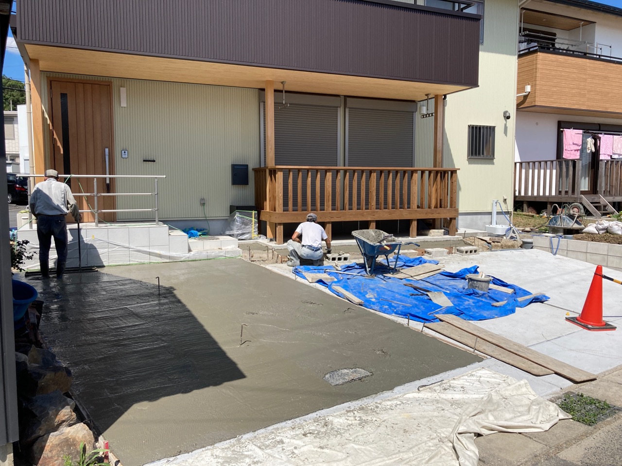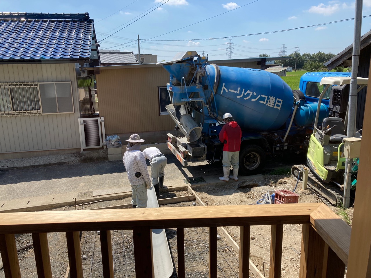 外部では駐車場の土間コンクリートを打設中。先週までの長雨が嘘のような快晴で、炎天下という事のみならず、コンクリートから発生する水和熱によってまさに灼熱地獄と化しています。十分に水分を摂り、熱中症にお気を付けください。