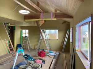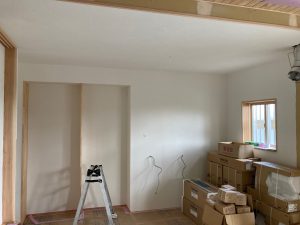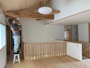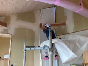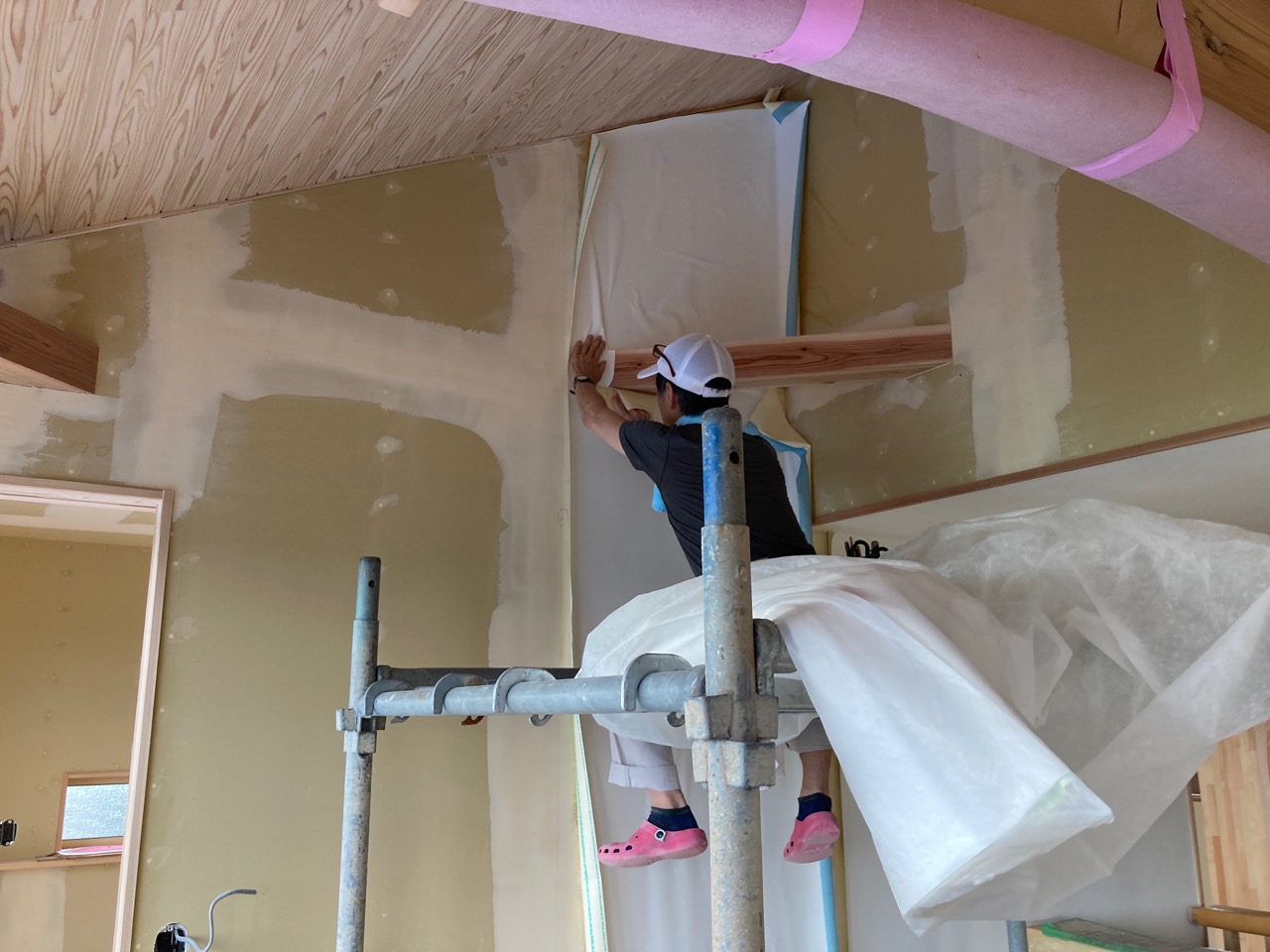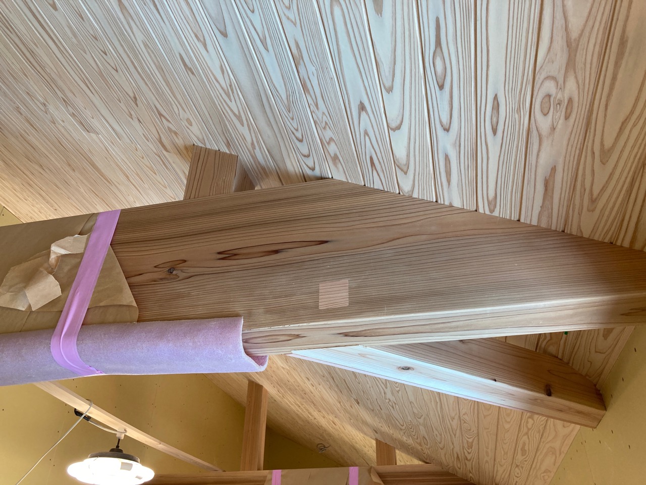 屋内ではクロス貼工事が進行中。明るい杉の羽目板や造作材、梁に対してさらに明るい真っ白なクロスのコントラストが映えています。