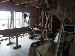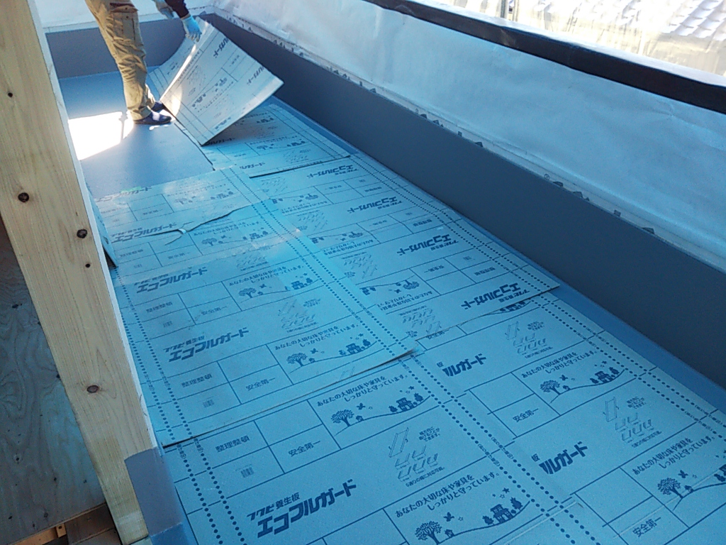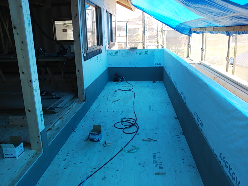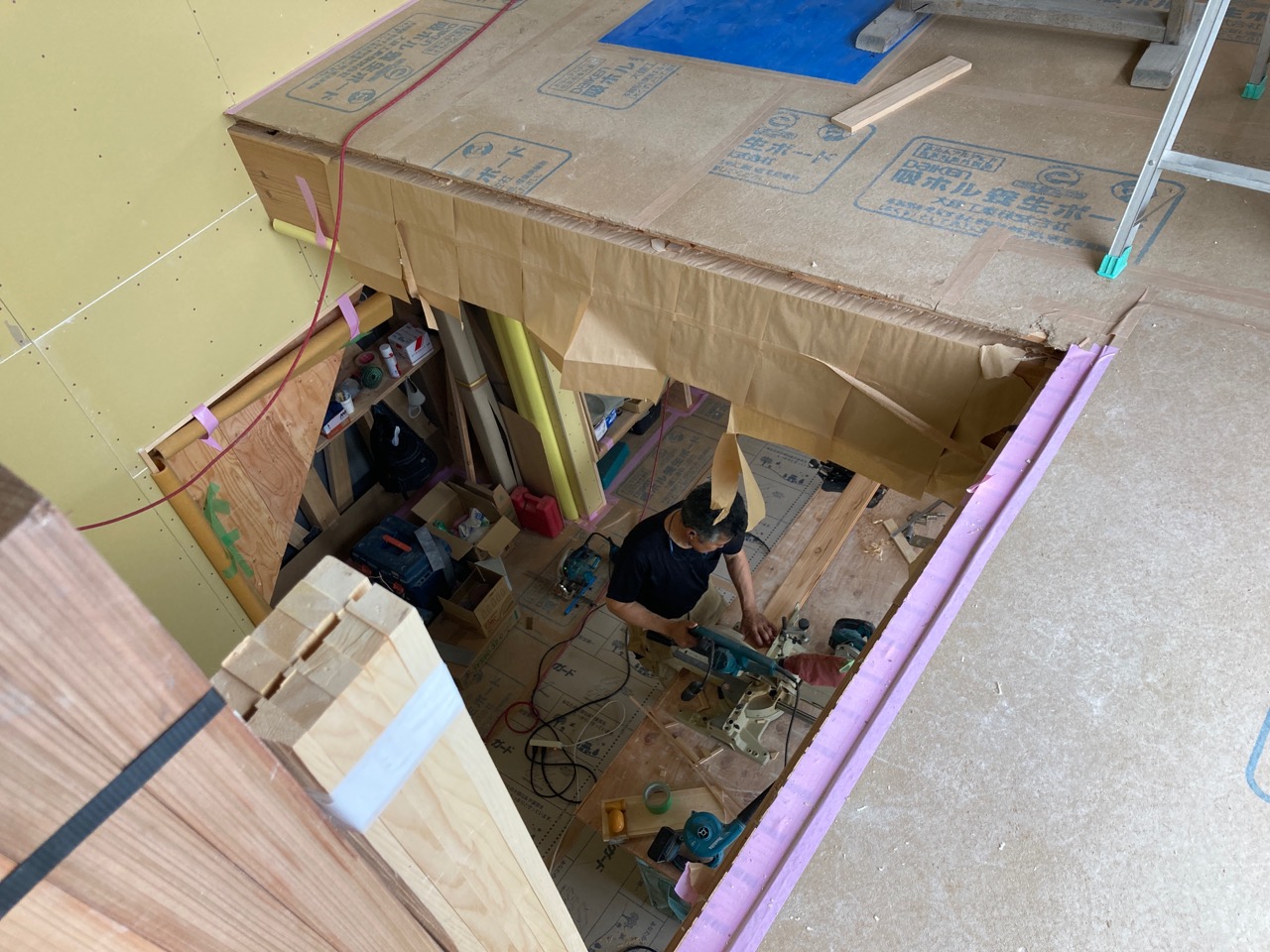 2階ではw辺棟梁がバルコニー防水下地の造作工事中でした。2階で布団が無理なく干せるようにと、1階の掃き出し窓の雨除けになるようにと、バルコニーを大きめに取りましたのでその分造作の手間も多くなります。
