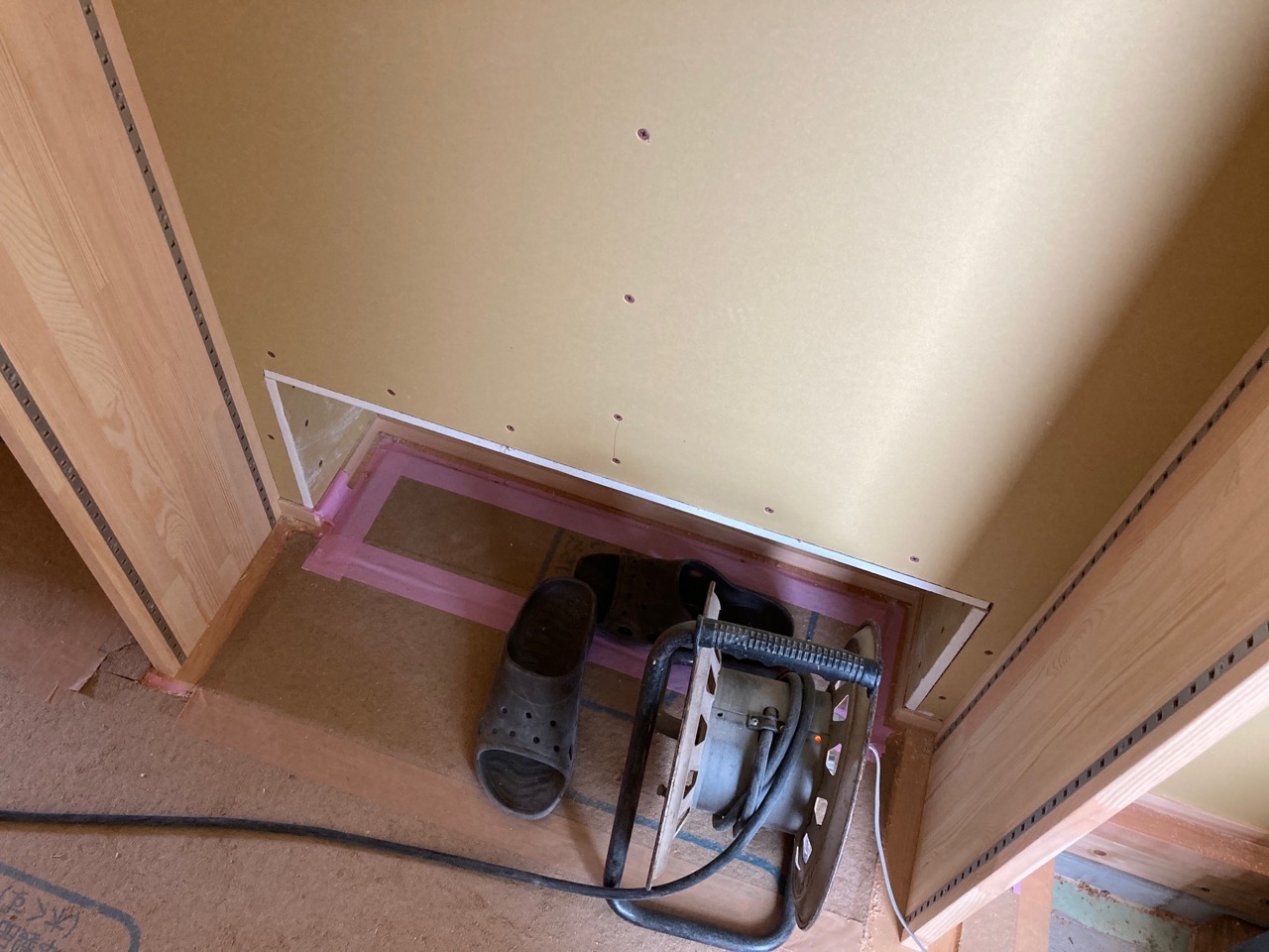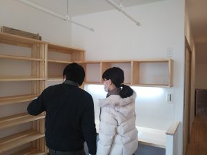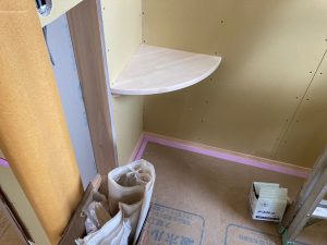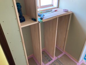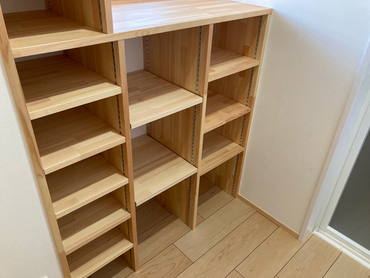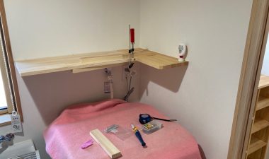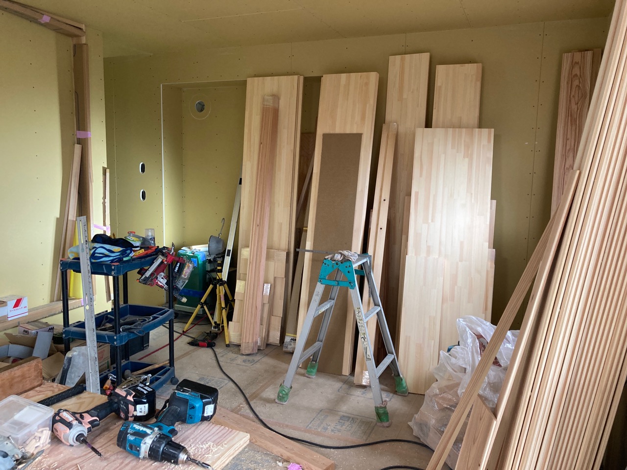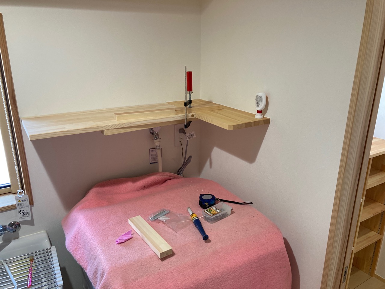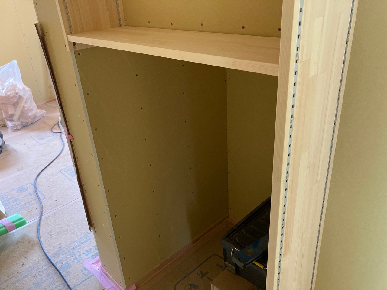 棚板の追加工事にやってきました。実際に生活されてみて『あと一段欲しい』『もう少し広めにしたい』などなどが分かってきて、後で加工できるのが造作工事の利点です。こういう時に電動工具など持っていると非常に便利です。