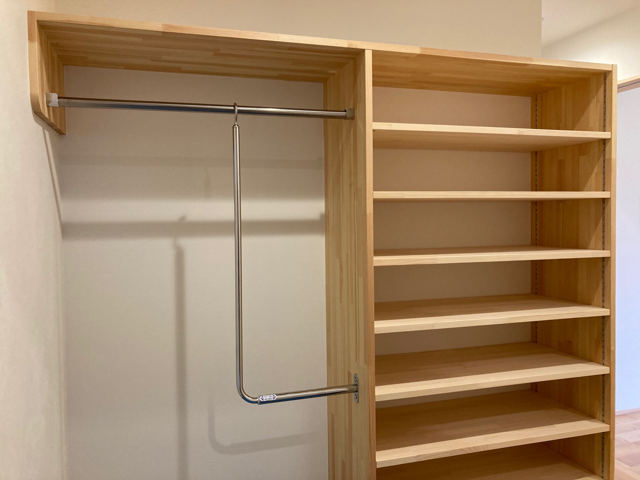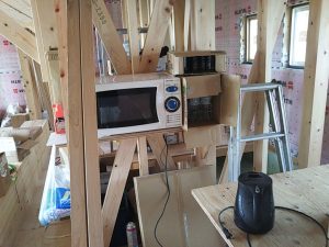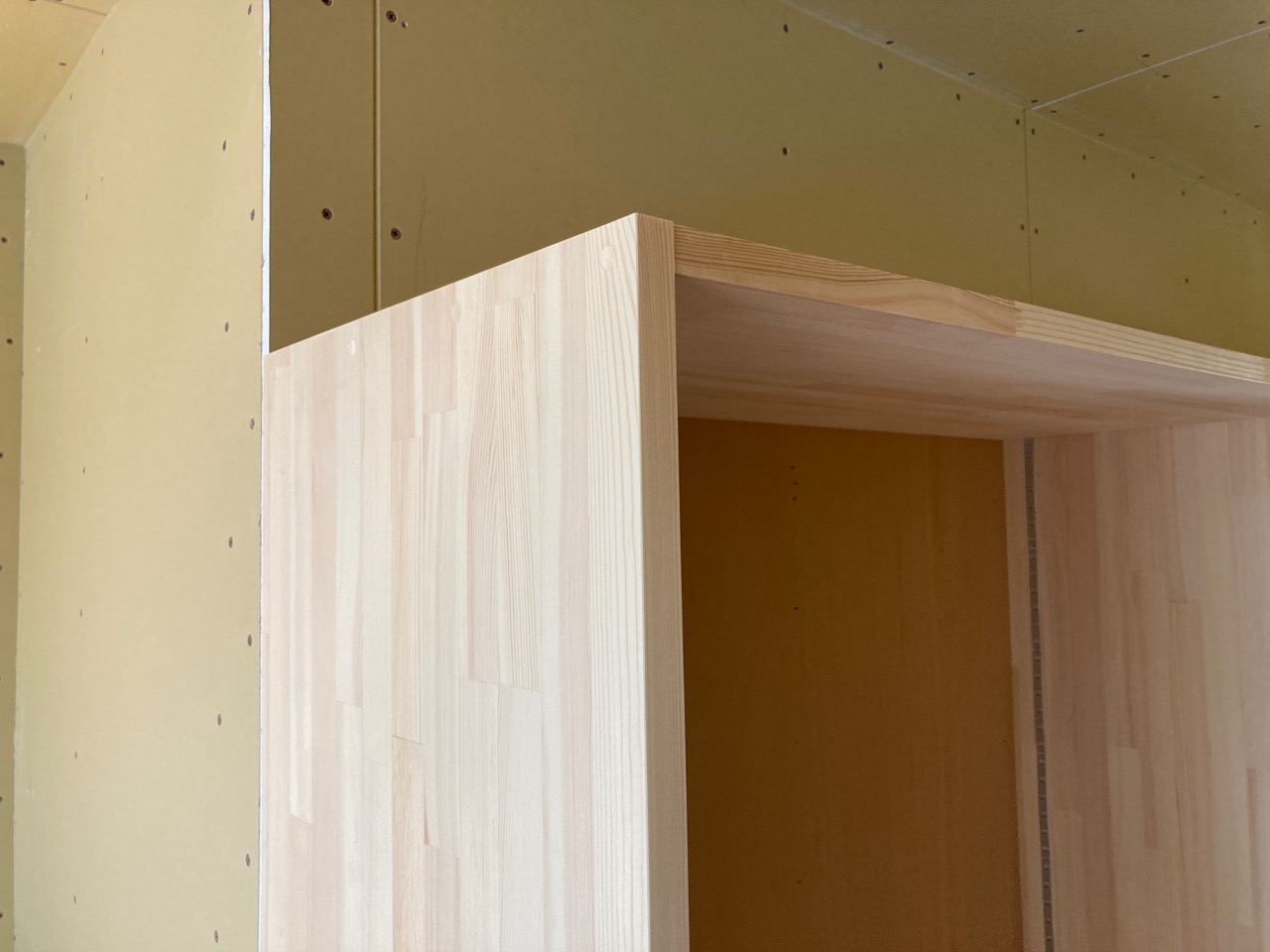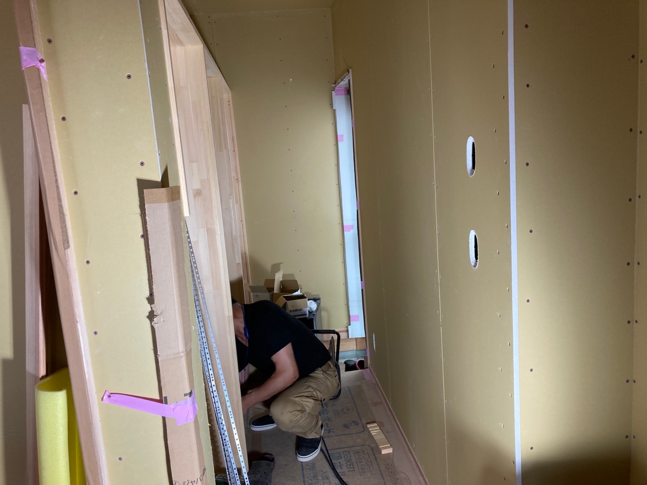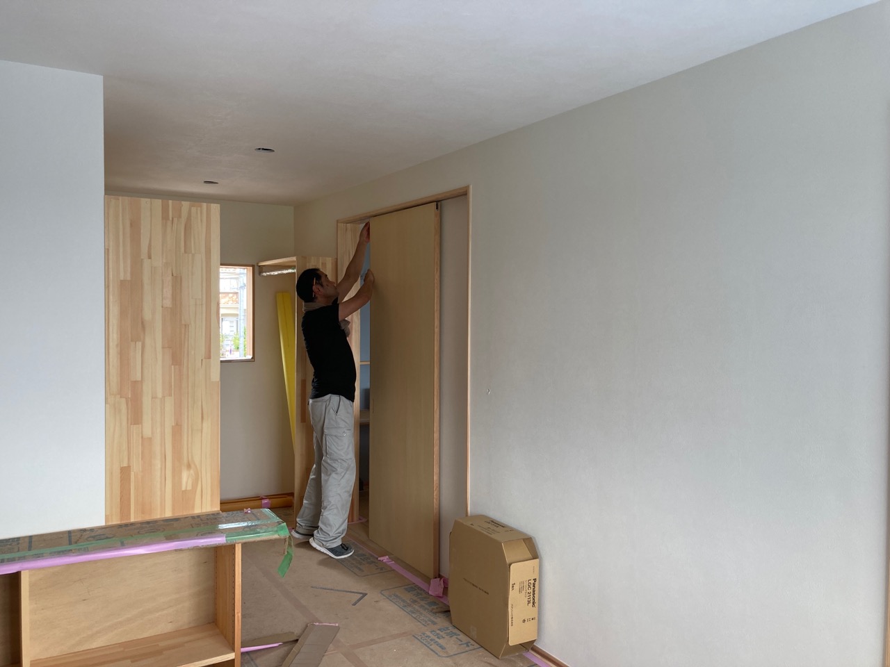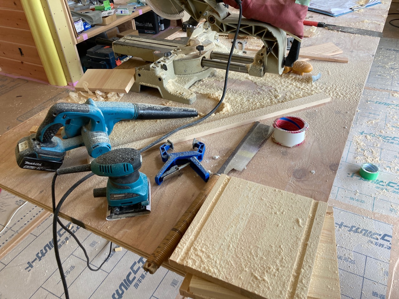 棚板の追加工事にやってきました。実際に生活されてみて『あと一段欲しい』『もう少し広めにしたい』などなどが分かってきて、後で加工できるのが造作工事の利点です。こういう時に電動工具など持っていると非常に便利です。