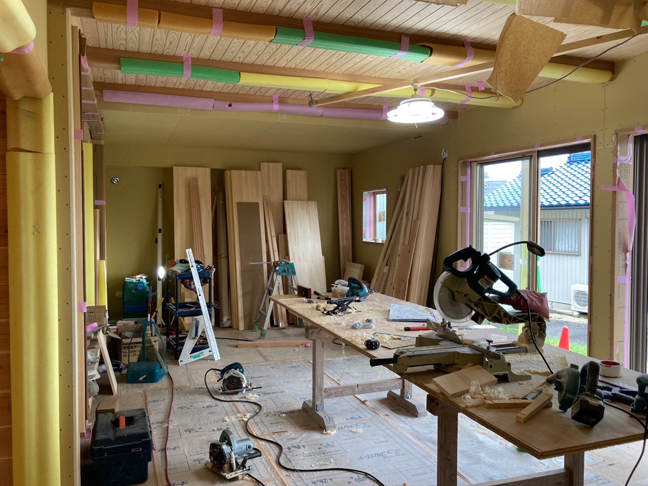 本日で棟梁が内部の造作を終えましたので、道具を引き上げて大掃除。こうして片付けてしまうと、つい先程まで電動工具が動き回り騒然としていた現場だったのが信じられないような静寂です。