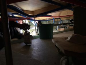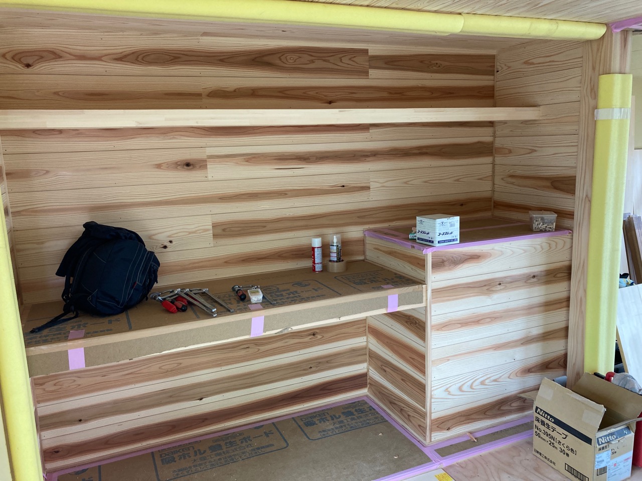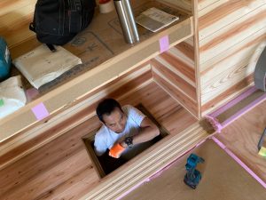 風は涼しいのですがやっぱり暑いものは暑い。w辺棟梁も汗だくになりながら棚の制作を続けています。棚板を切断した時に出る木の粉が汗をかいた二の腕に張り付いていき若干汗を吸っていきます。