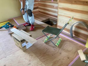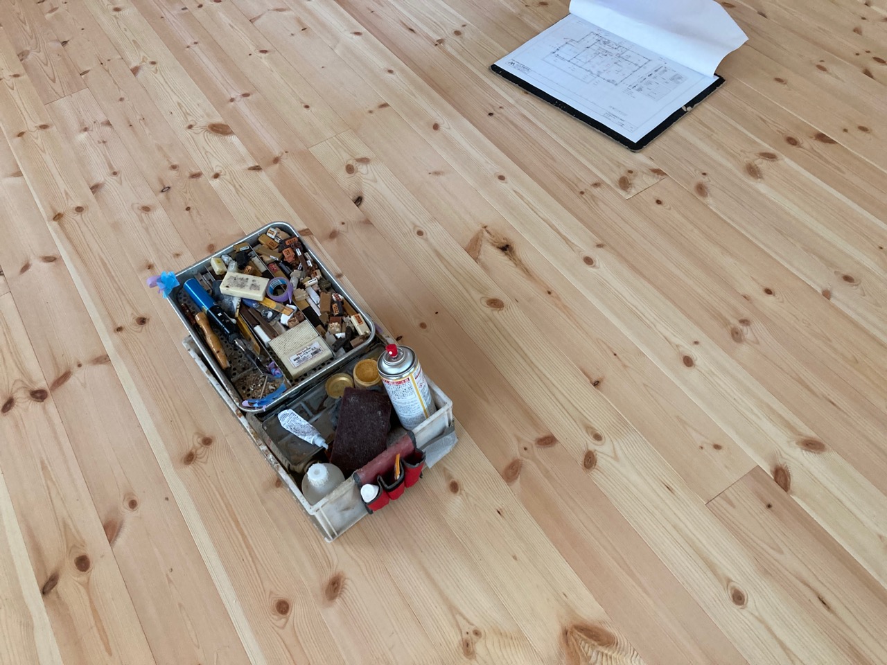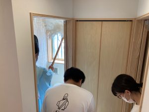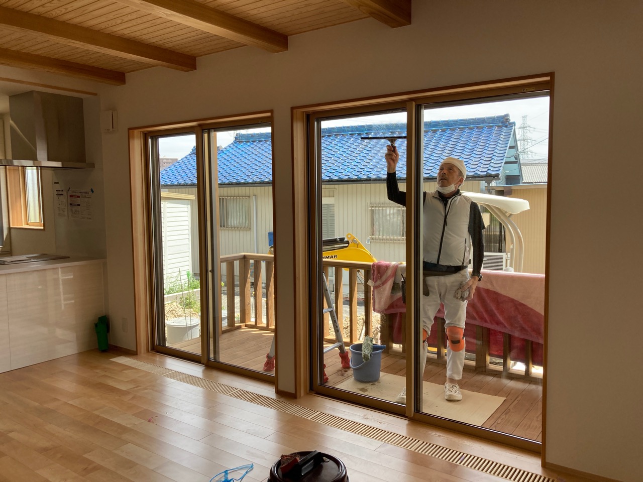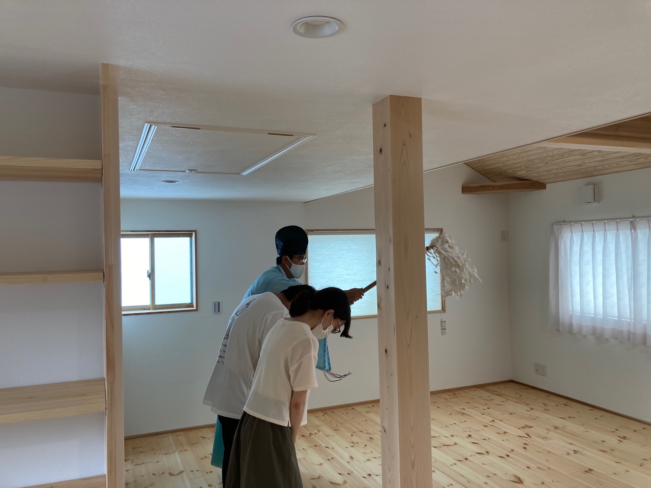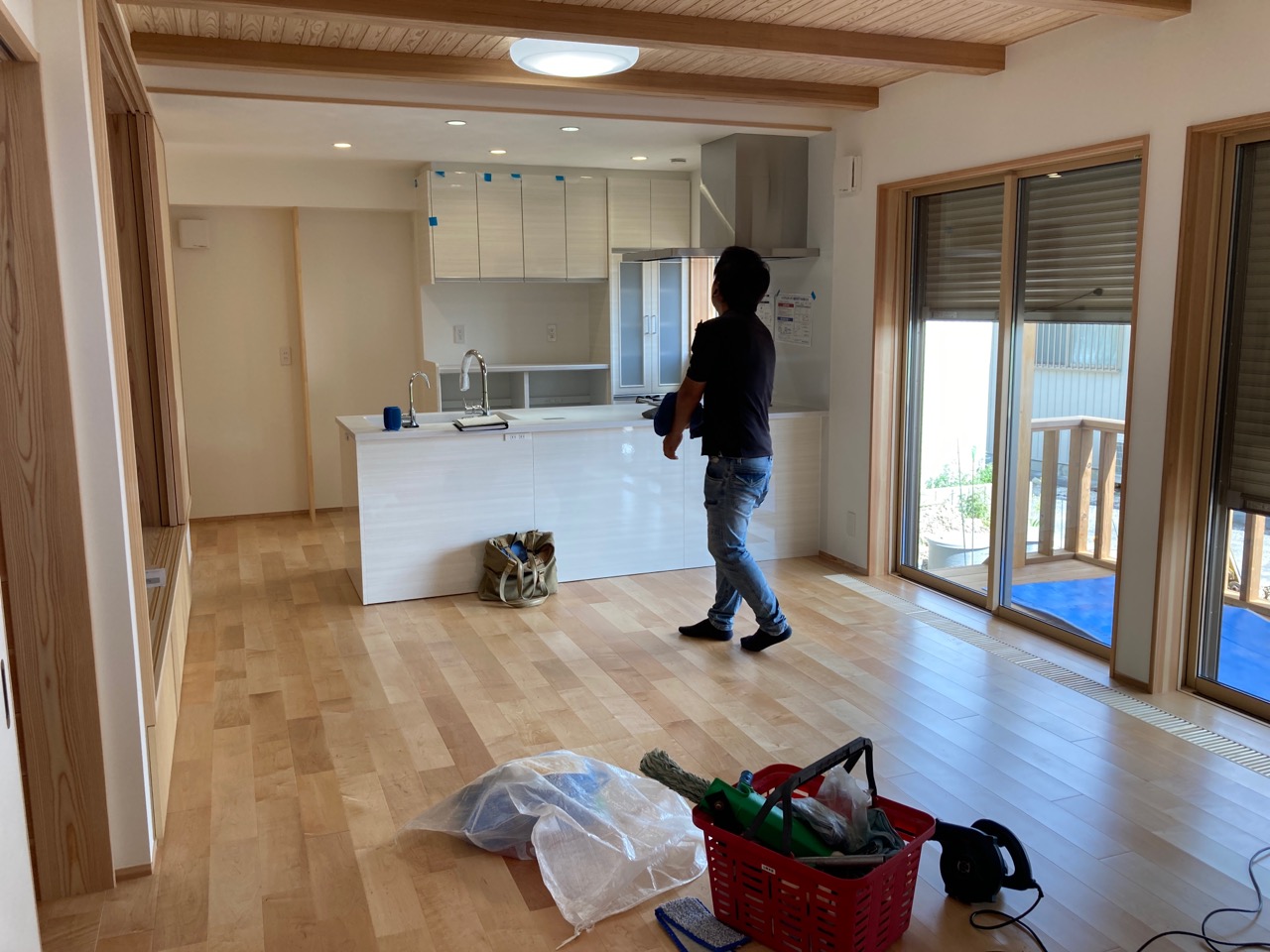 クリーニング工事はいつものy建さん。いたるところをキレイに掃除し、無垢の木のフローリングに自然塗装を施してくれます。