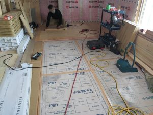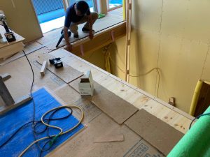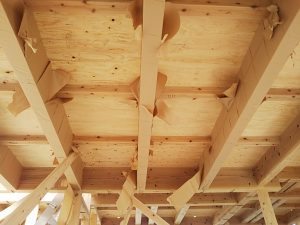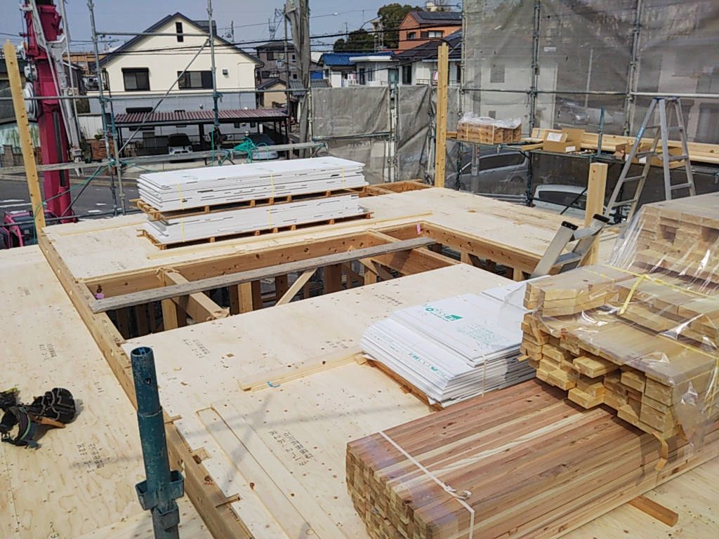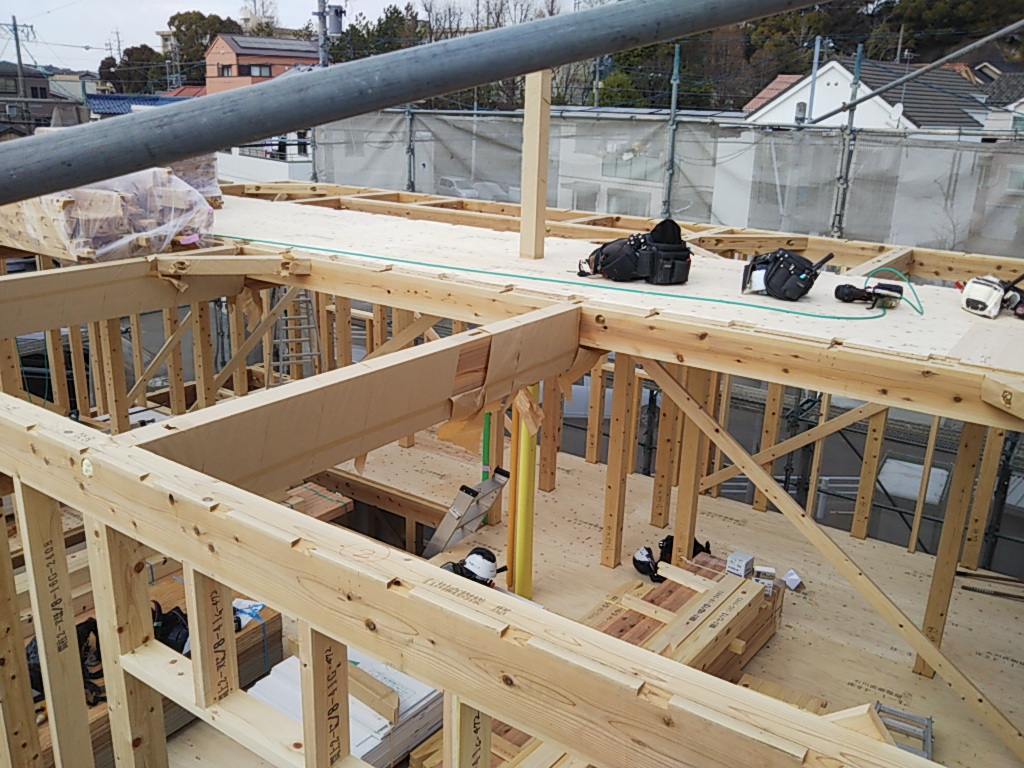 2階の床下地となる構造用合板が敷かれました。床の下地となると同時に長期優良住宅に要求される耐震等級を満たす水平構面となります。性能表示制度における水平構面の計算に基づき、所定のピッチ、厚さの合板を敷きならべます。昔は梁が組みあがったら、45㎜角の根太を30㎝おき位に並べその上に薄い合板を敷く、という工法が主流であったため上棟作業時ではなく翌日からの作業で床下地を敷いていました。水平構面を取るために上棟時に合板を敷き詰めるこの工法の方が作業も安全になったと言えます。