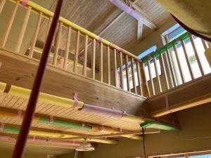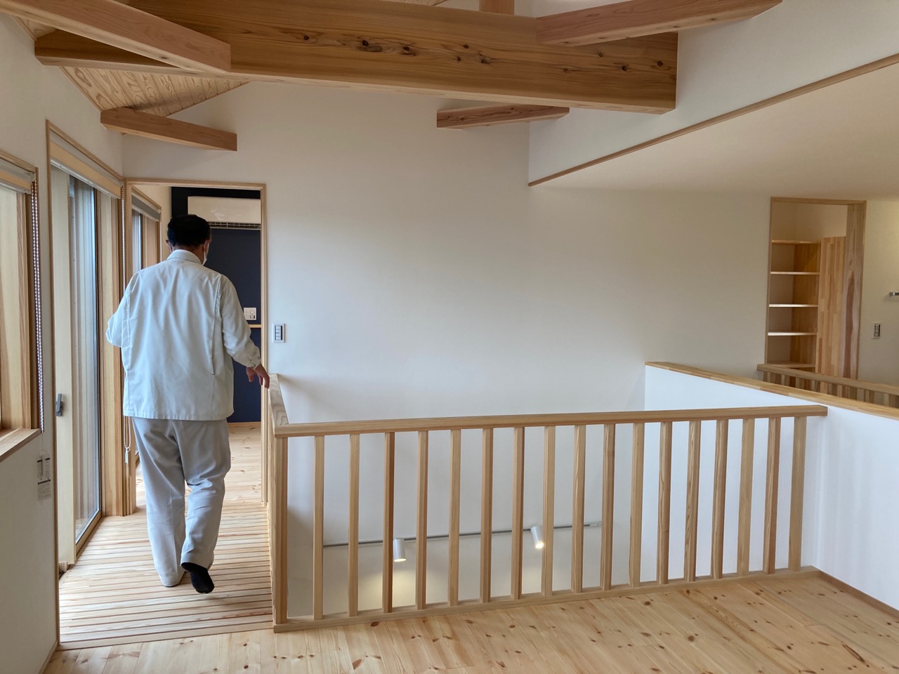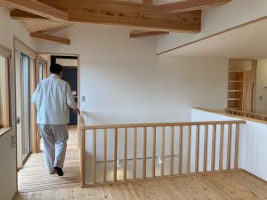 棟梁は吹抜まわりの手摺の下地作成中。高所恐怖症の筆者にとっては背筋が寒い体勢です。