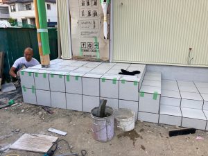 外装、内装の仕上工事が賑々しくスタートしました。玄関ポーチのタイル貼にy口左官さんが来てくれました。ポーチの独立柱に使用している柱脚金物が独特のカーブを描いているため、その曲線に合わせてタイルを加工するのも一苦労。『誰だこんな形の金物を選んだヤツは』と追及されそうです。