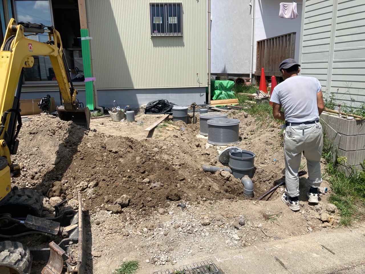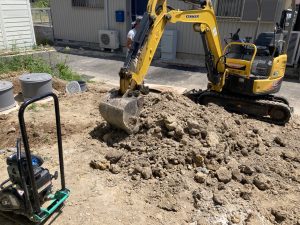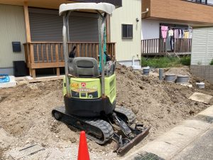 屋外では外部駐車場にあたる部分の土掘削を始めています。炎天下につき十分にお気を付けください。