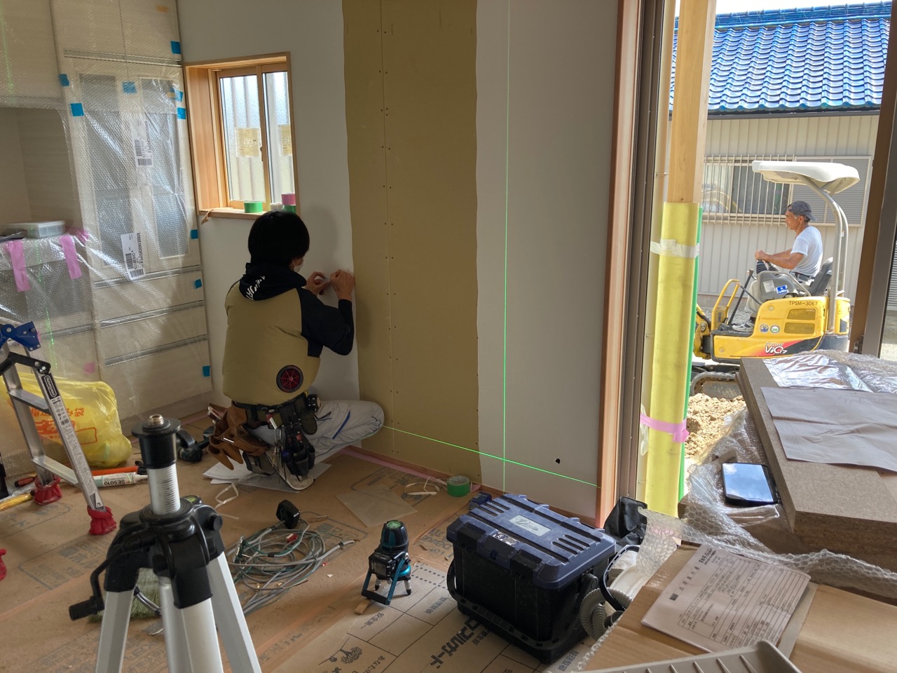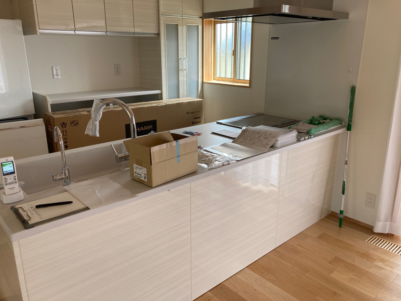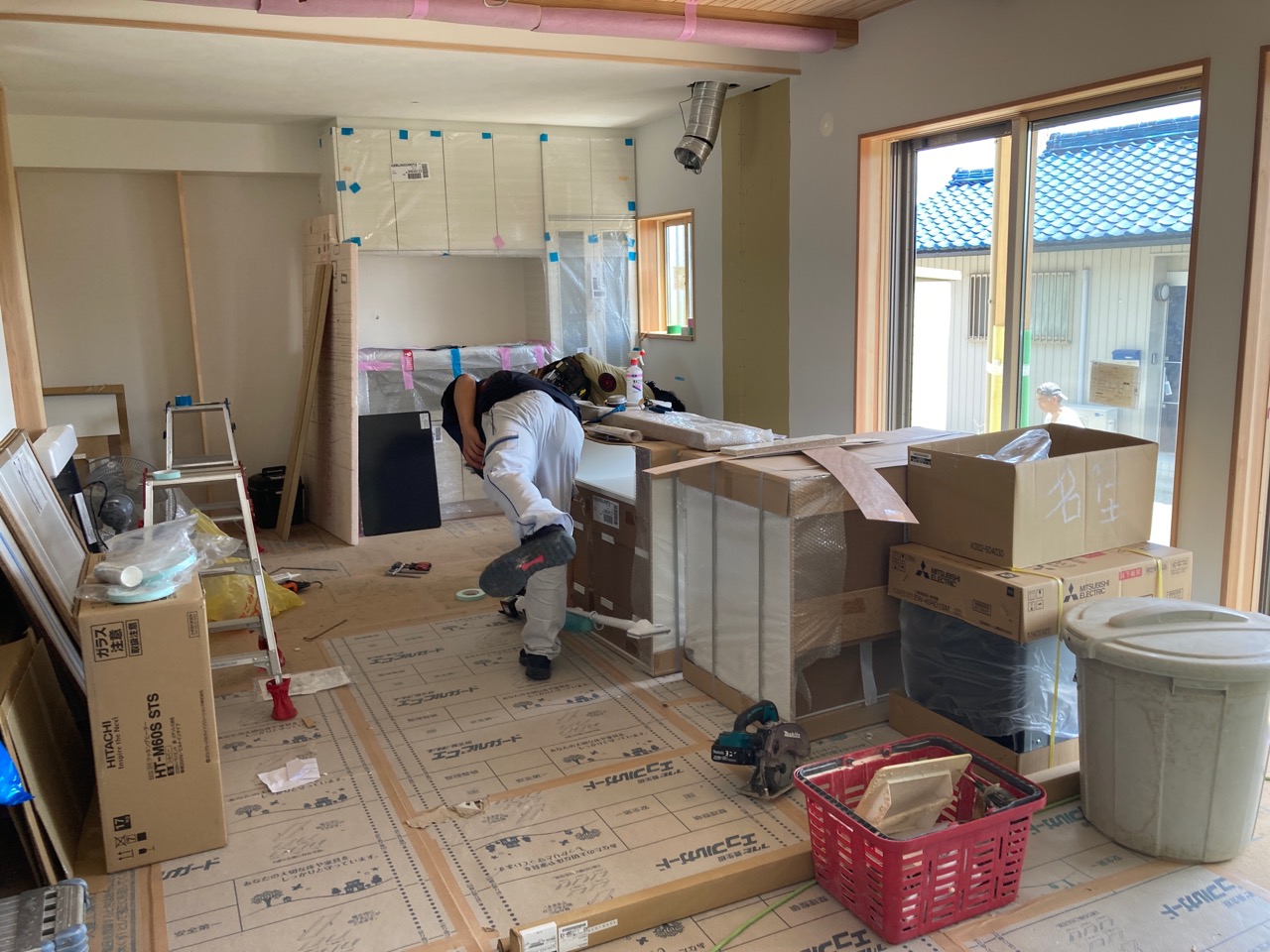 工期も差し迫ってきたため、仕上げ工程はいろんな業者さんが入り乱れます。本日だけで、クロス工事、給排水接続工事、電気設備工事、建具工事、家具工事、外構工事と現場内がカオス状態です。それに伴い作業車の数も比例して増えていますが、幸い駐車スペースは多くありますので助かっています。