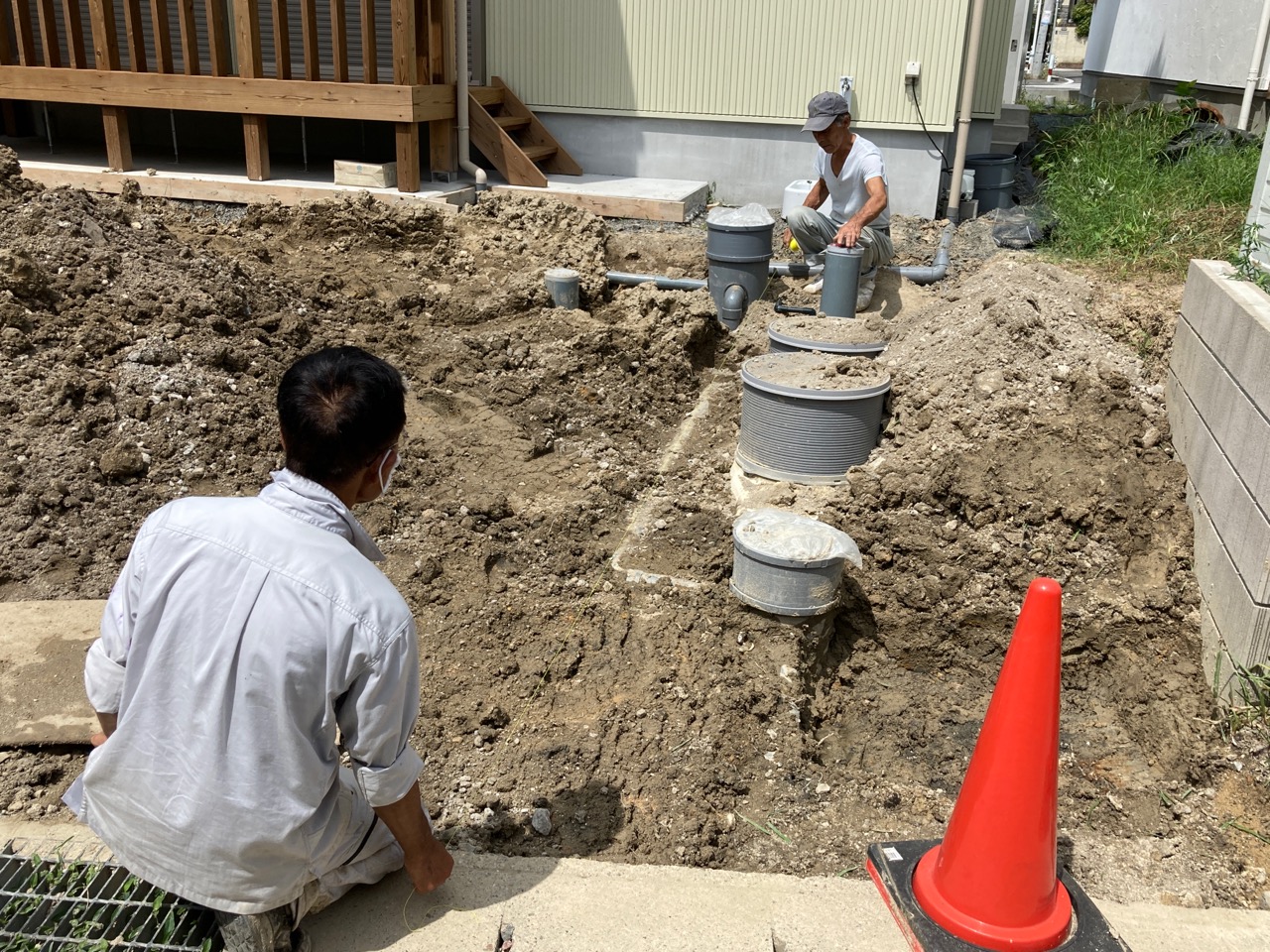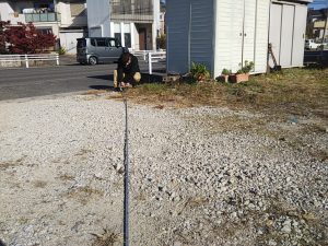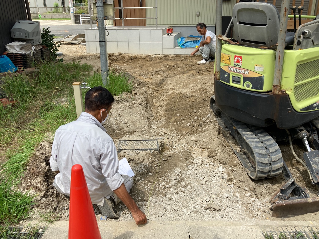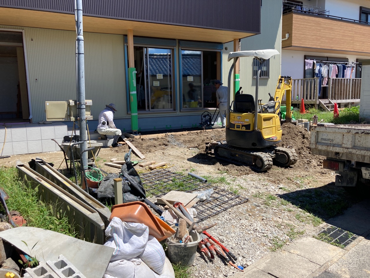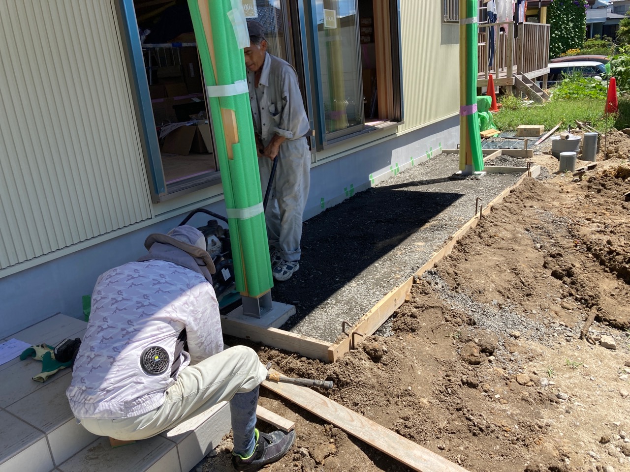 本日も炎天下での外構工事。午前中にわずかに現れる日影と空調服が熱中症のささやかな対策です。