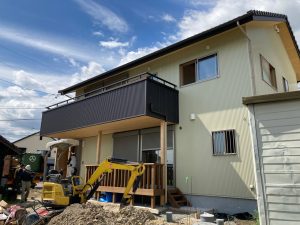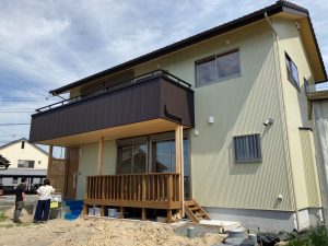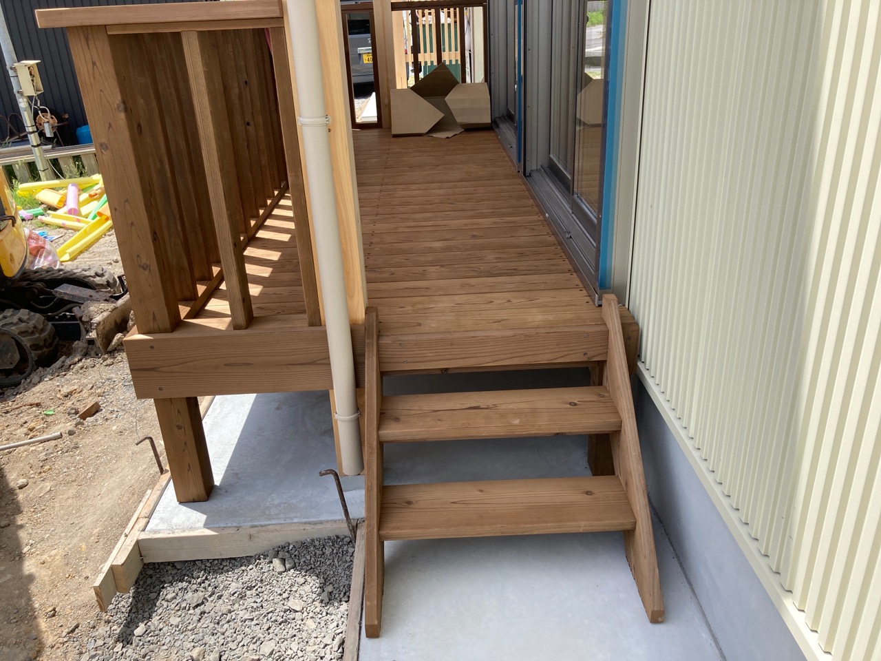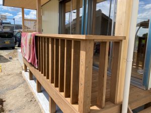 棟梁の手によってウッドデッキが完成していました。一間飛び出たバルコニーを庇とし、雨天でもある程度の洗濯物が干せる何ともウラヤマシイスペースです。引戸を開放すれば天候の良い日にはセカンドリビングとして機能します。