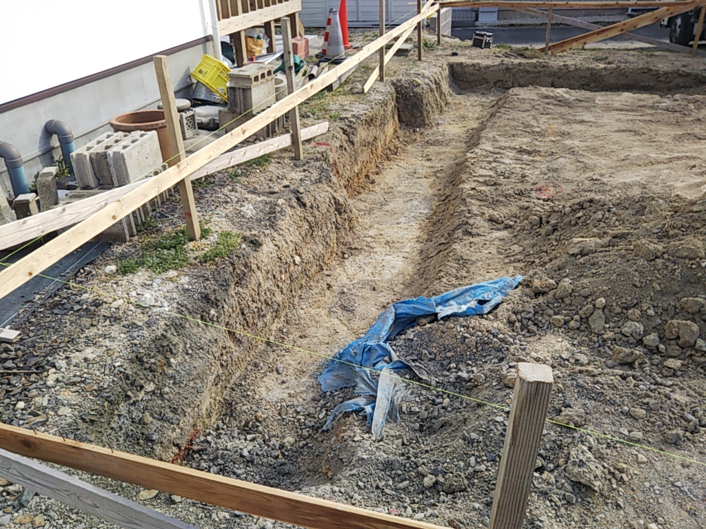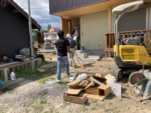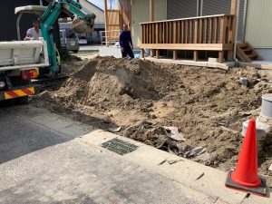 外構工事の駐車場土間コンクリートを敷設するため、まずは表土から掘削して撤去していきます。結構な量の土が出るため、4tトラック数杯に渡って撤去処分をしなければいけません。
