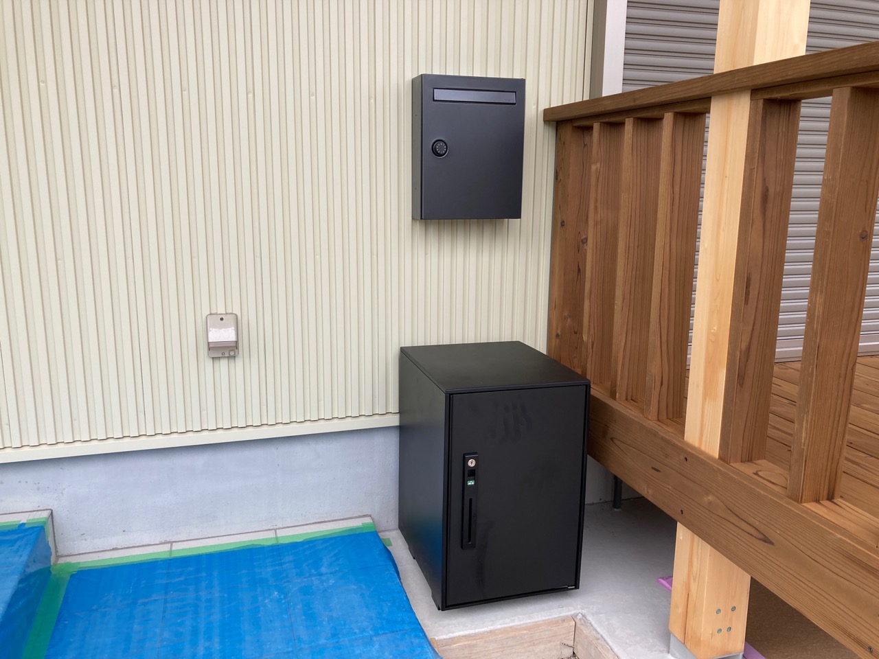 玄関前の宅配ボックスとポストです。郵便受けは従来通りお好きなデザインと取付位置に取付けます。近年では留守宅でも宅配の箱を受け取る事ができるように大きめの宅配ボックスを設置される方が増えています。これにより宅配業者の負担も軽減され、受け取る方の手間も省けるという一石二鳥のボックスです。
