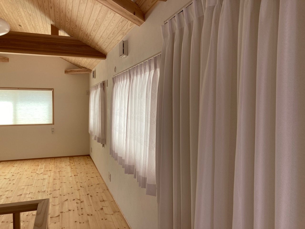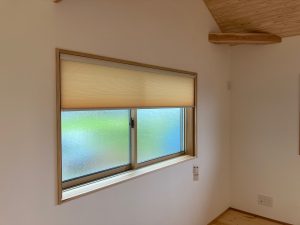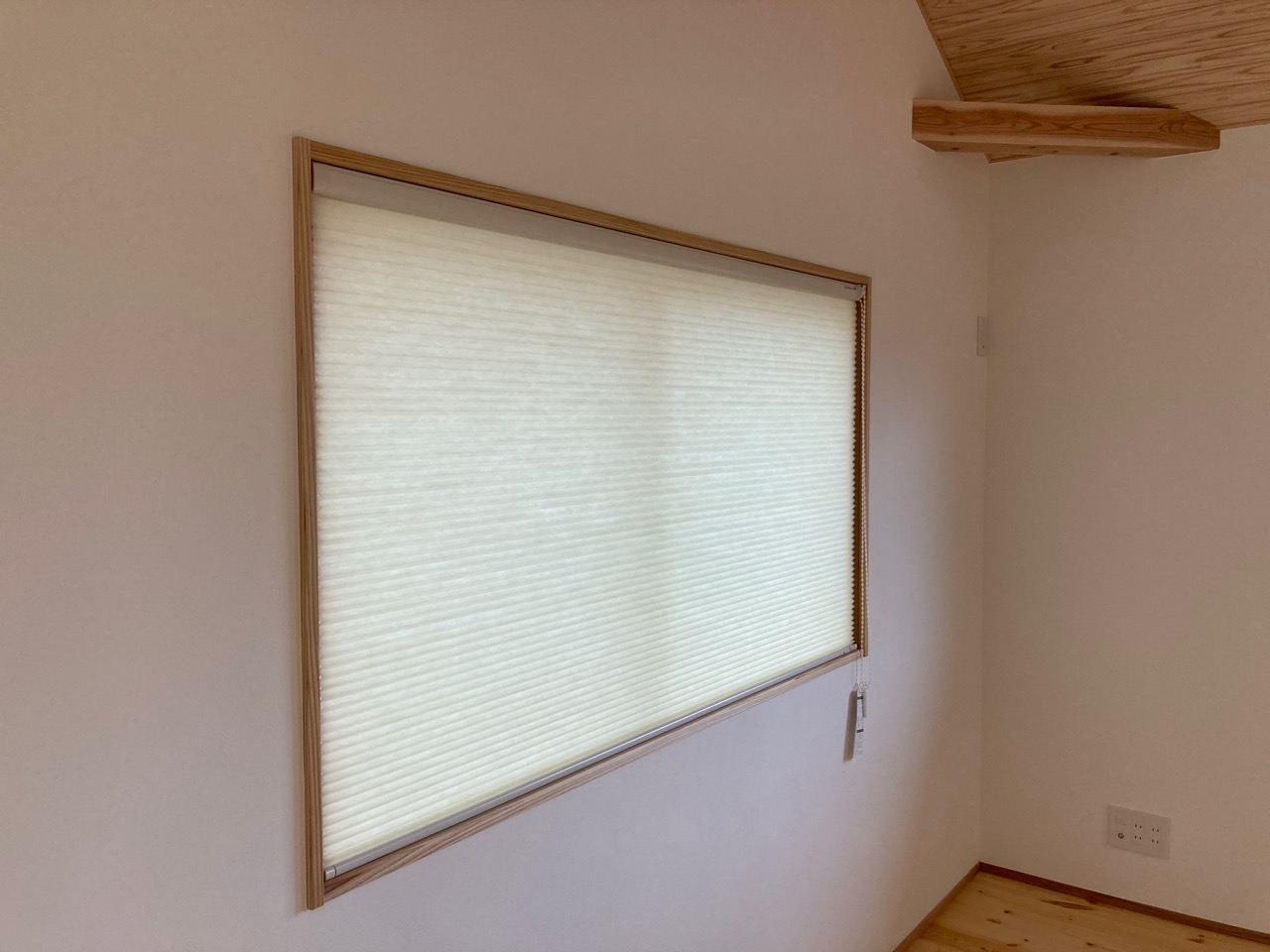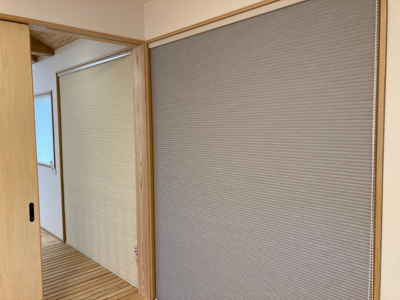 毎度おなじみ、ハニカムサーモスクリーン。高気密高断熱住宅における弱点である開口部の断熱補強として有効なスクリーンです。i様も部屋ごとにスクリーンの色を変えるというこだわりです。