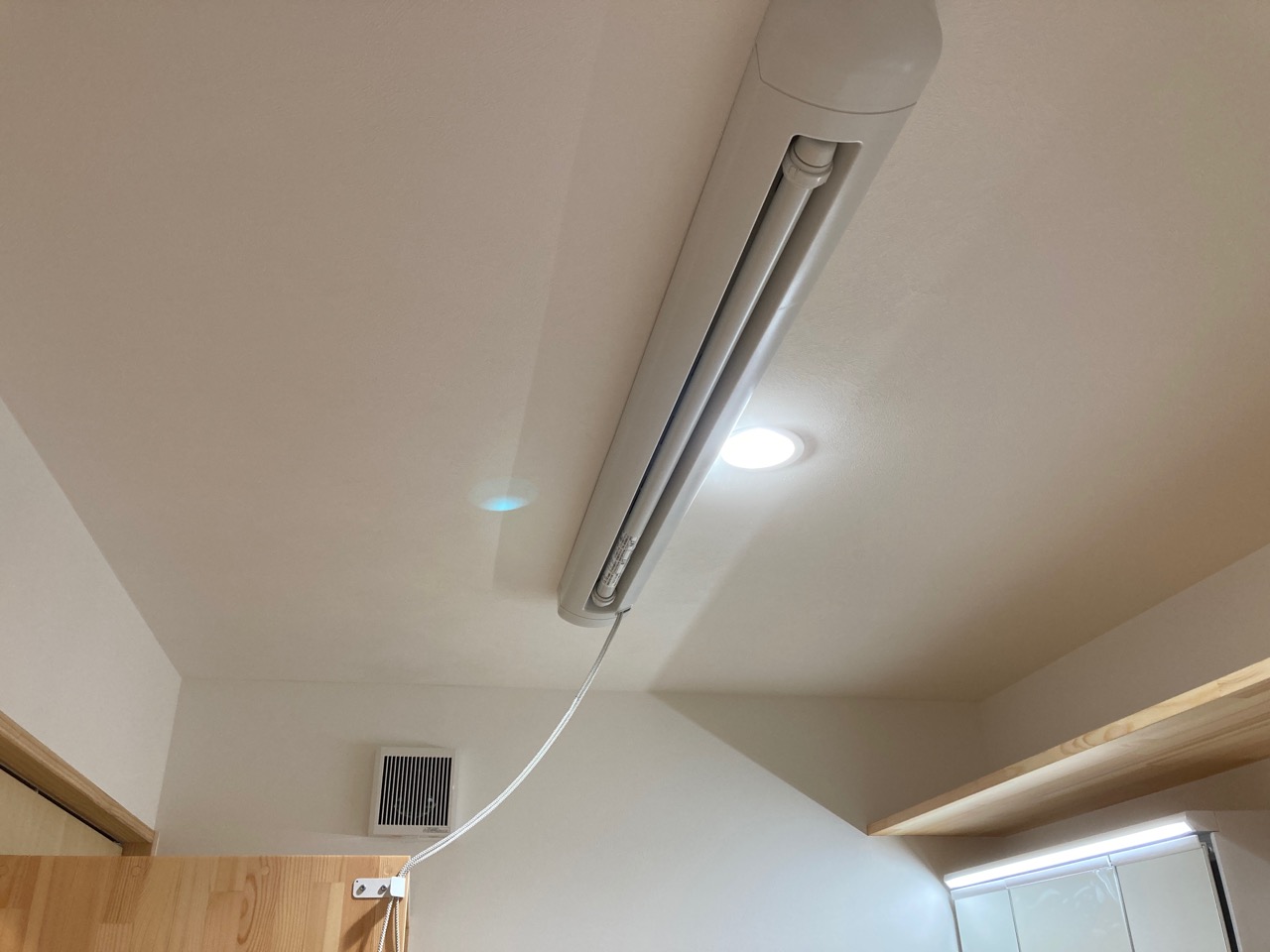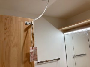 某P社製の脱衣室の天井物干竿『ホシ姫サマ』。ひもを回転させる事で竿が下りてきます。洗濯物をハンガーにかけて吊っておくことができ、使用しない時は天井まで収納しておきます。この操作紐、だいたい人の顔位の高さまで下がっています。使わない時に邪魔にならないように近くの棚にフックを取付けて掛けられるようにしてみました。
