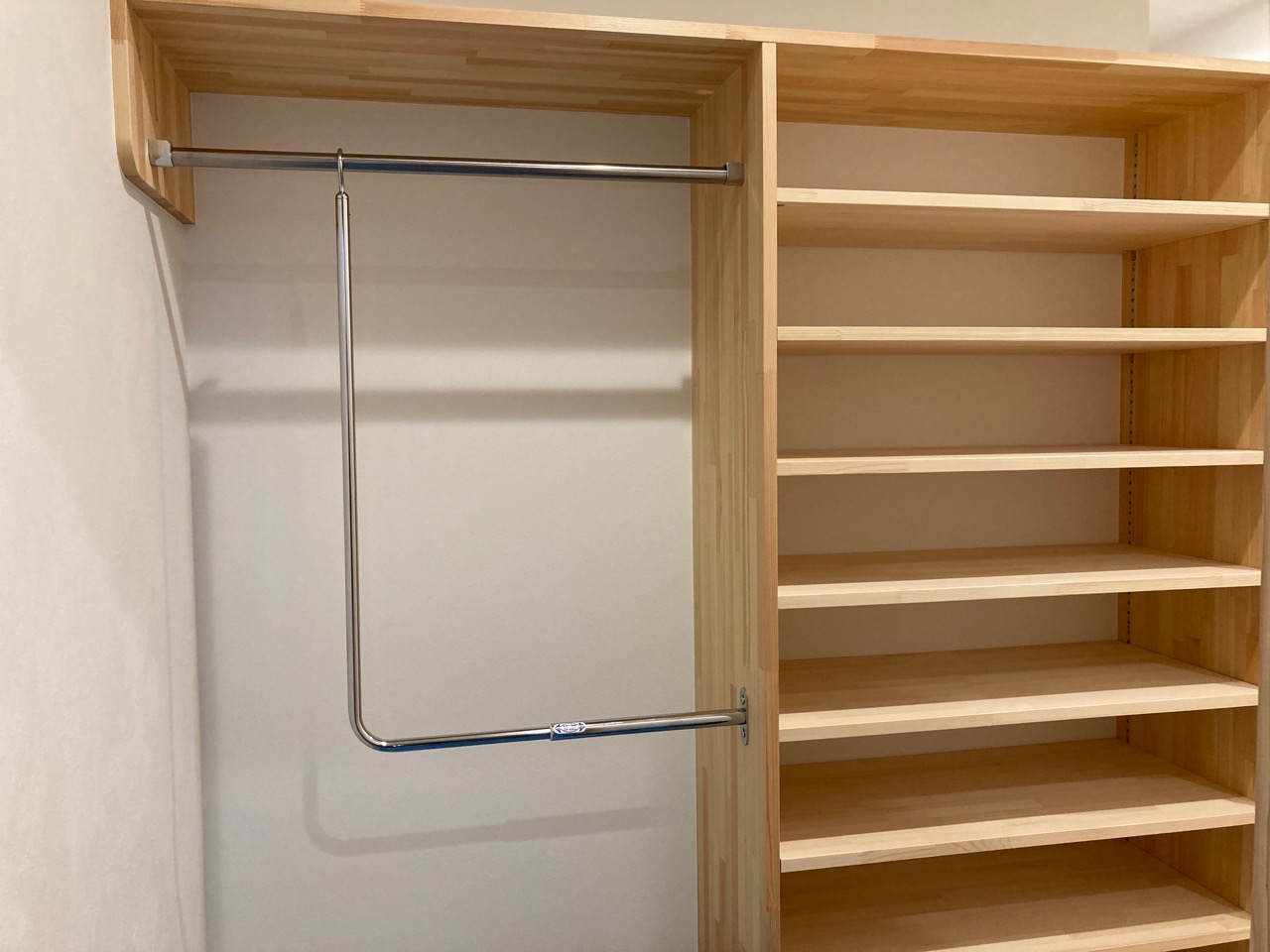 シューズクローク内に長さの変えられる2段ハンガーパイプを取付けました。ロングコートなど長いものをかけたい場合、床にゴルフバッグやベビーカーなど置きたい場合には縮めておく。ジャケットなど短いものをたくさんかけたい場合は伸ばしておく、といった使い方ができます。