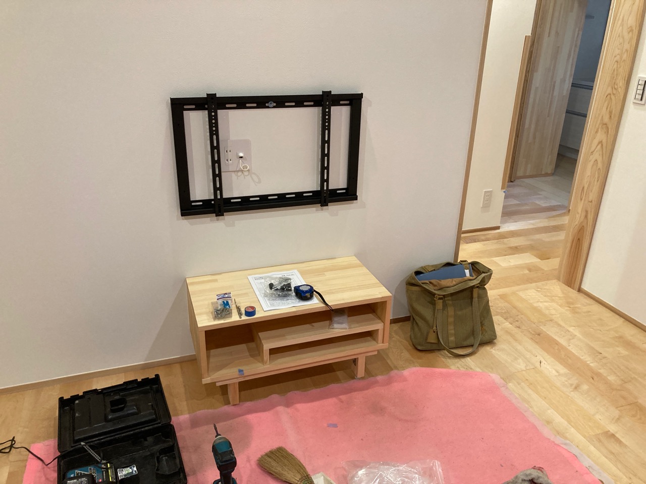 お引渡し、お引っ越しを前にいろいろなものが取り付けられました。陶器の洗面ボウル、レースカーテン、物干し金物、壁掛けテレビなど。お引っ越しされてからも壁掛時計、リモコンのホルダー等取付けたい物があればうかがいます。