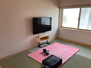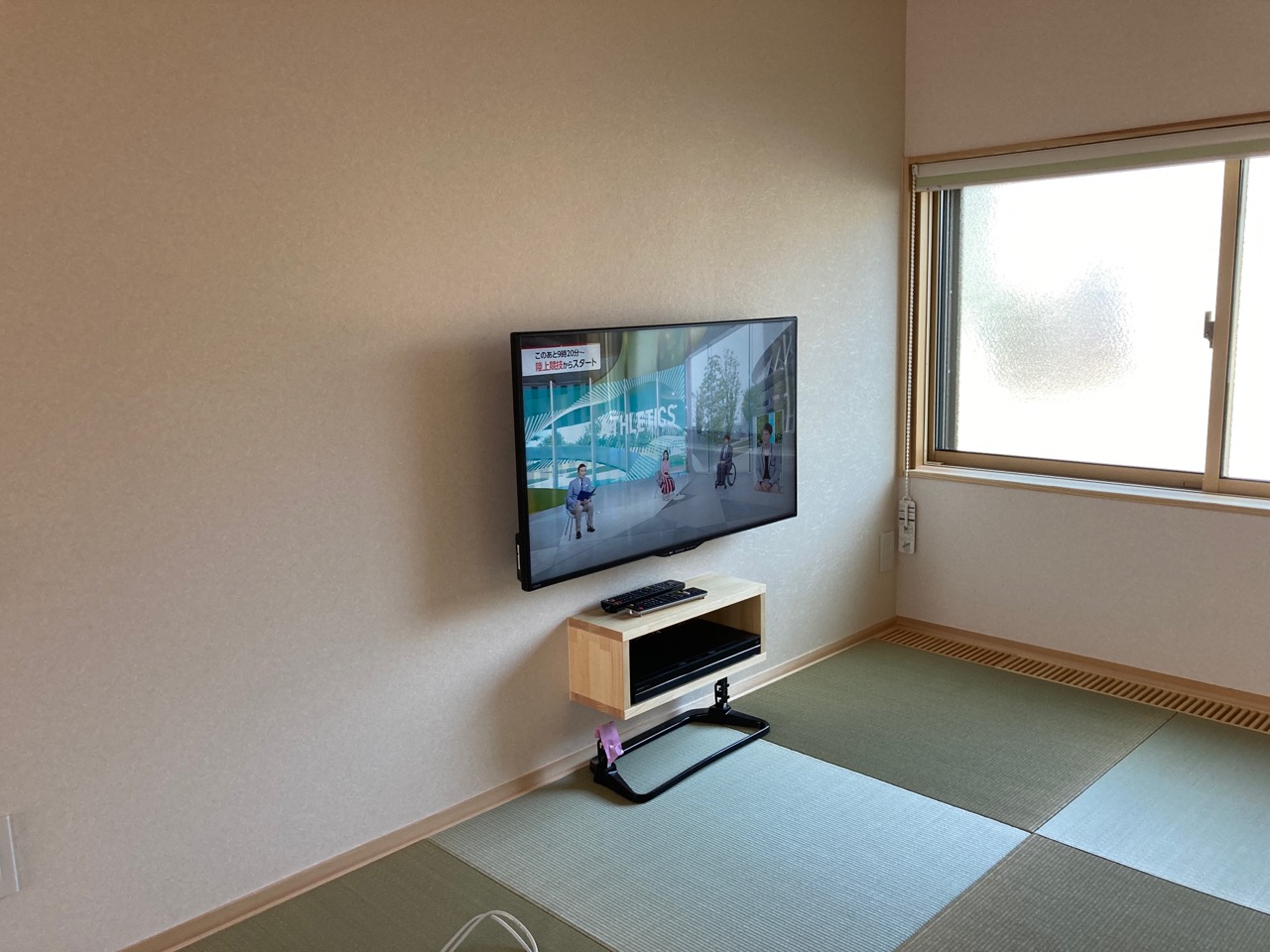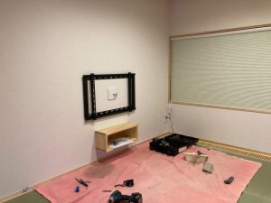 各箇所のテレビは壁掛け式とし、テレビに適合する壁掛け金物を取付けました。台に置く方法と違いすっきりして良いかと思いますが、工事中に壁の中に電源やHDMIなど各配線を仕込んでおく必要があります。取付位置もテレビのメーカーや品番によって少し異なるようですので早い段階での購入が必要になりそうです。