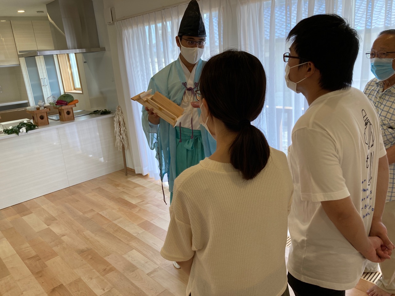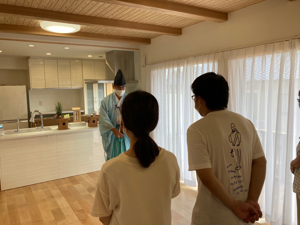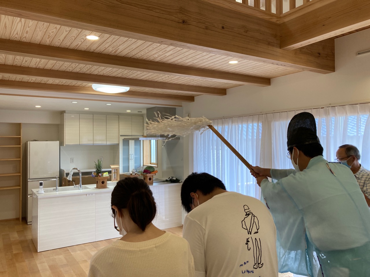 お引渡しの後、竣工祭が執り行われました。地鎮祭と上棟際にも行ってもらいました『大音量の』神主さんです。前回は言っても工事中でしたが、完成した室内での大音声、家中に響き渡ります。そうする事によって隅々まで祓い清める、という事なのかもしれません。