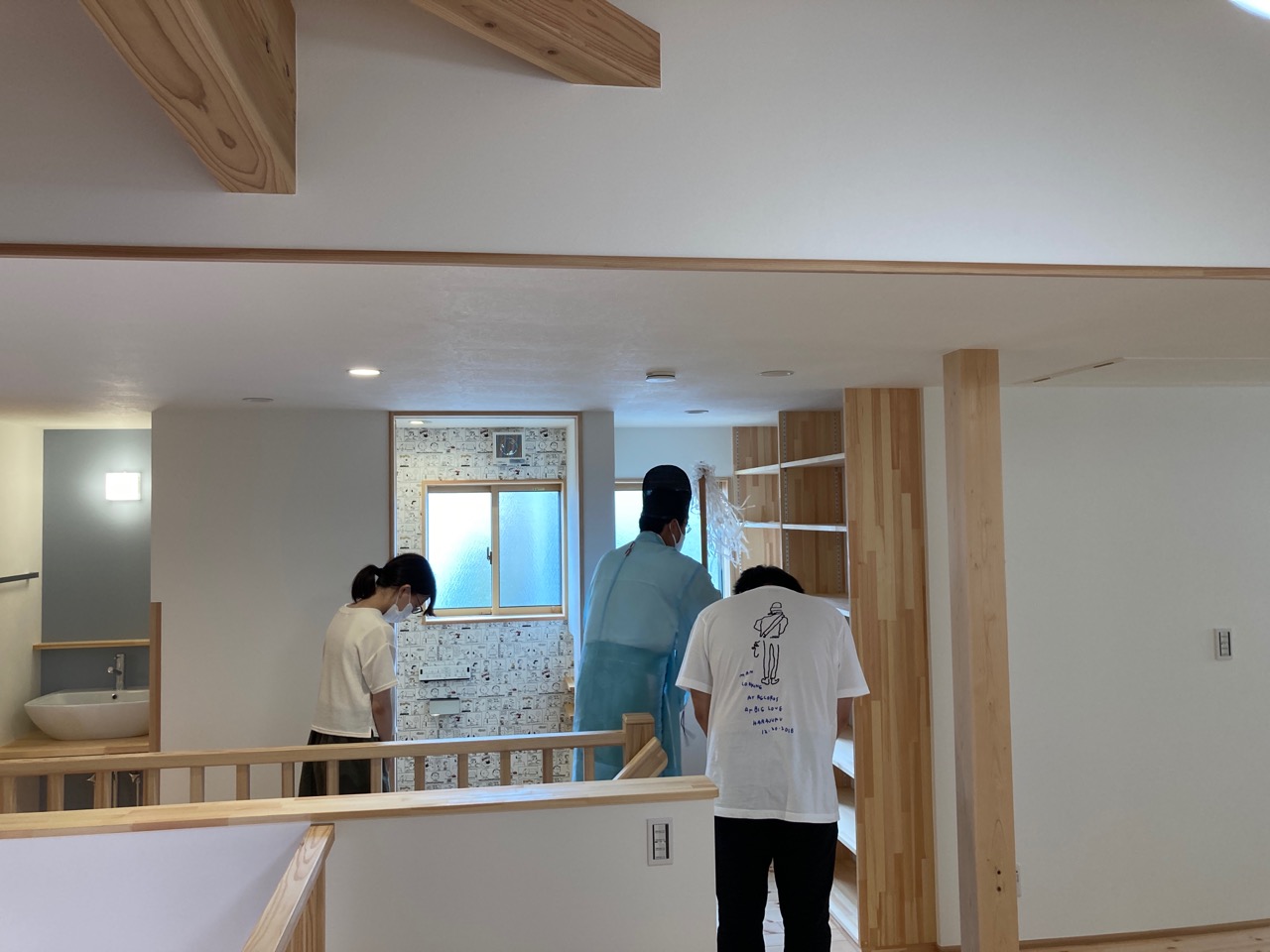 本日は内装のクリーニング工事。いつもながら現場の汚れが一気に洗い流されるこの時が一番爽快な瞬間です。現在隣に仮住まいしているi様も内覧にみえました。今までの現場がいきなり『住宅感』が出てきている、と感激しきりです。