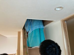エアコンの先行配管用の壁開口をしています。今回は間取りの都合上、室外機を離れたところに置きたいため、天井裏を通す隠蔽配管を行います。
