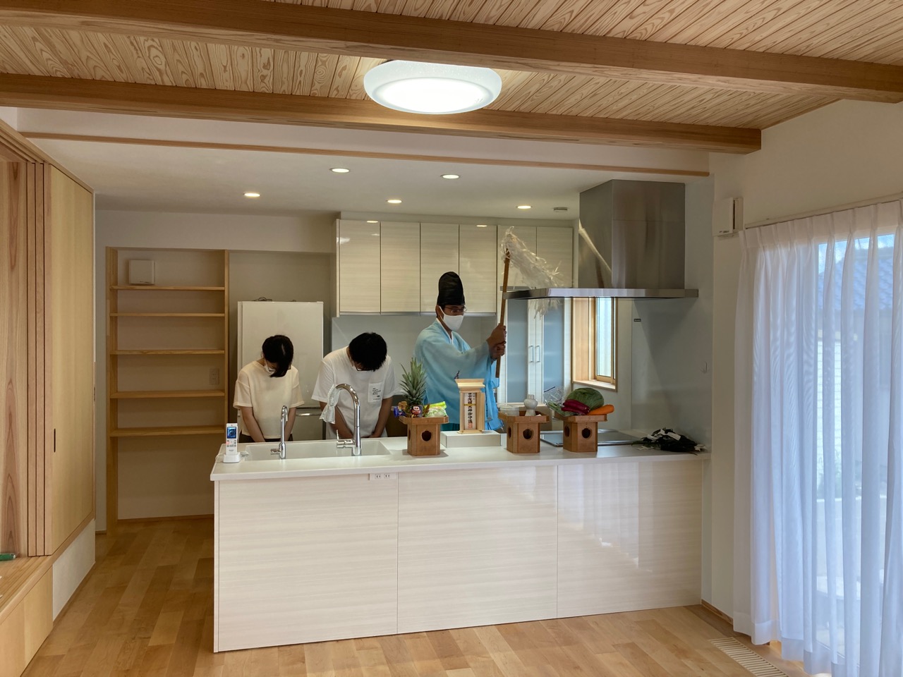 祝詞奏上の後、住宅内の部屋を一つずつ祓って回ります。部屋だけでなく収納棚のある部分もお祓いをしてもらいました。最後に台所、やはり住宅の一番中心となる煮炊きのための火を扱う場所(IHヒーターなので火は出ませんが)を一番大事にお清め、カグヅチの神を鎮めるそうです。