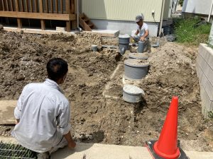i様にうかがったところこの土地は旧くは川であり、その脇には水田が広がっていたとか。地名にもさんずいが付くので、おそらくはそのような旧歴だろうと想定されていました。改良工事の職人さんから聞くと、約2m程掘削すると水が湧き出てきたそうです。その下は河原の礫層となり、オーガーも入っていかなかったため、改良杭の支持層としました。